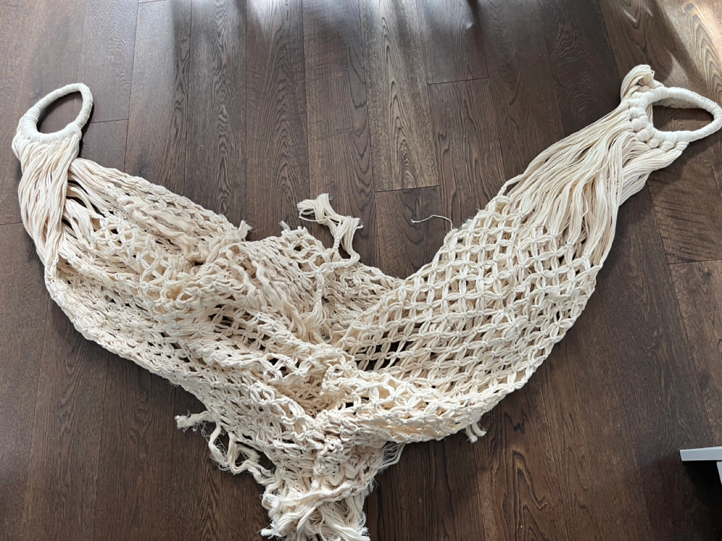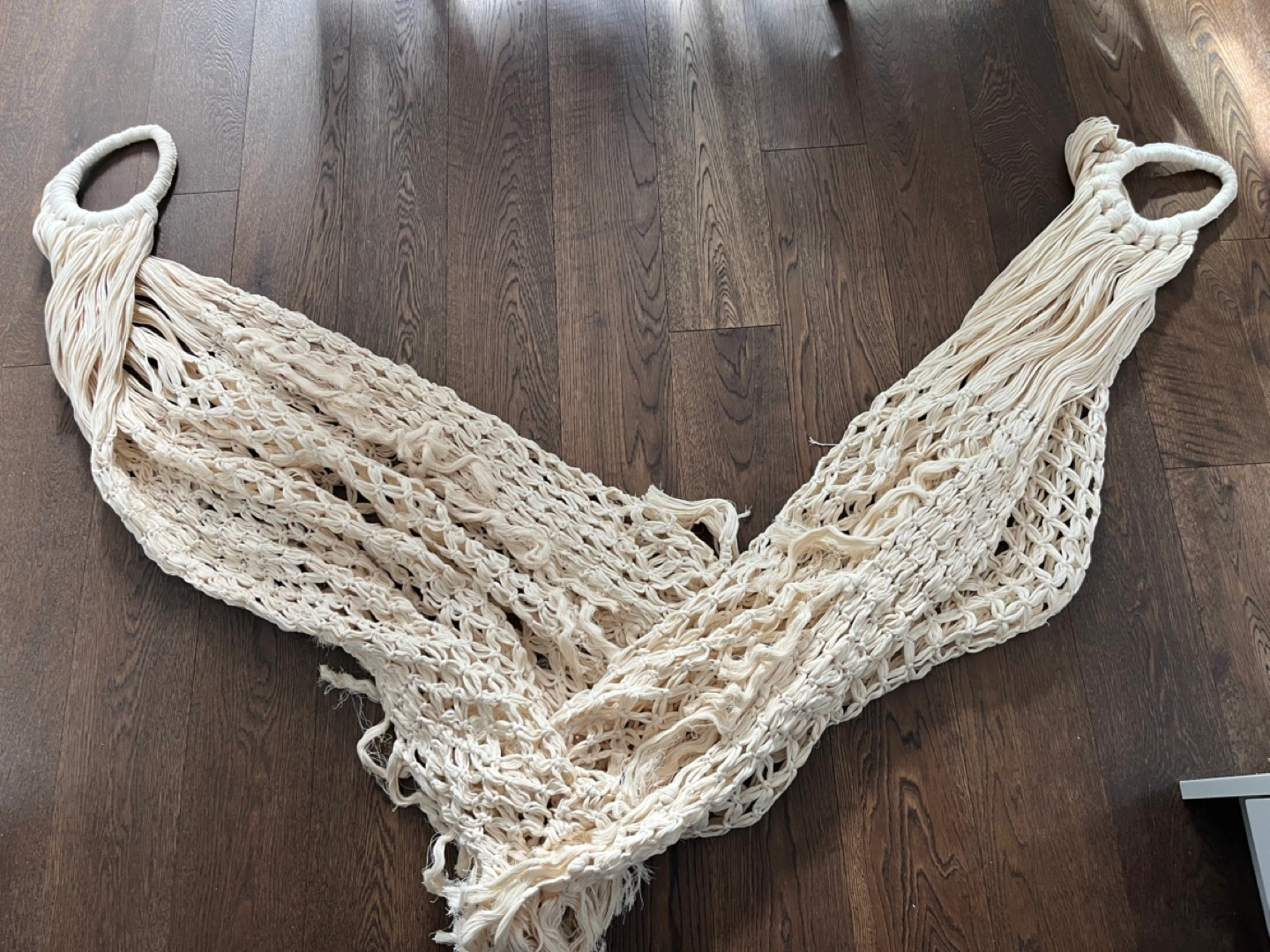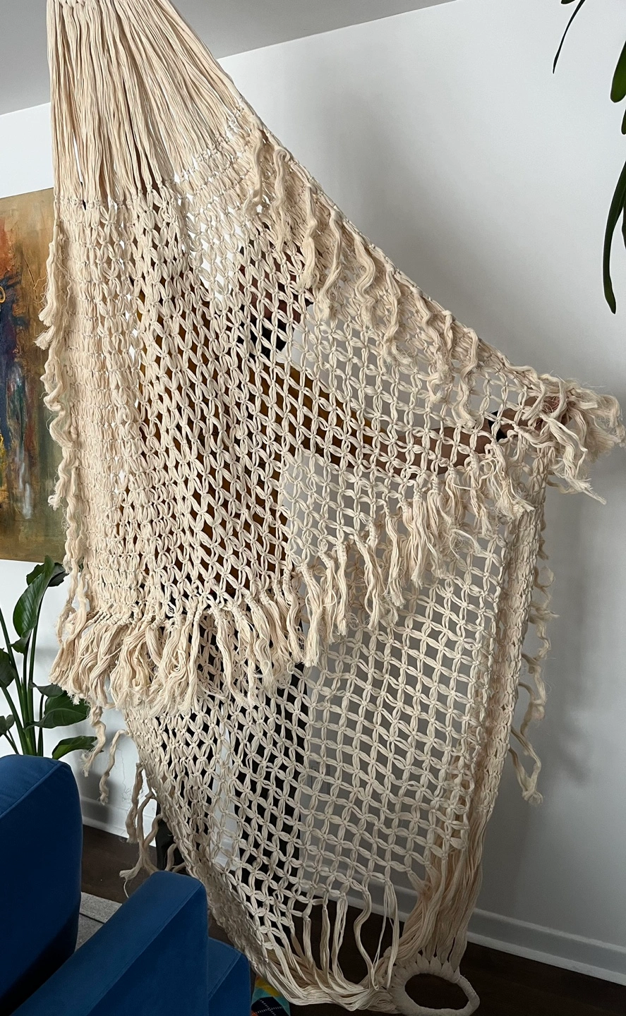 Cream-coloured macrame hammock. Features a unique knotted design and long fringe. Perfect for adding a bohemian touch to your home. Unassembled. Could be used for nice wedding decor too.
