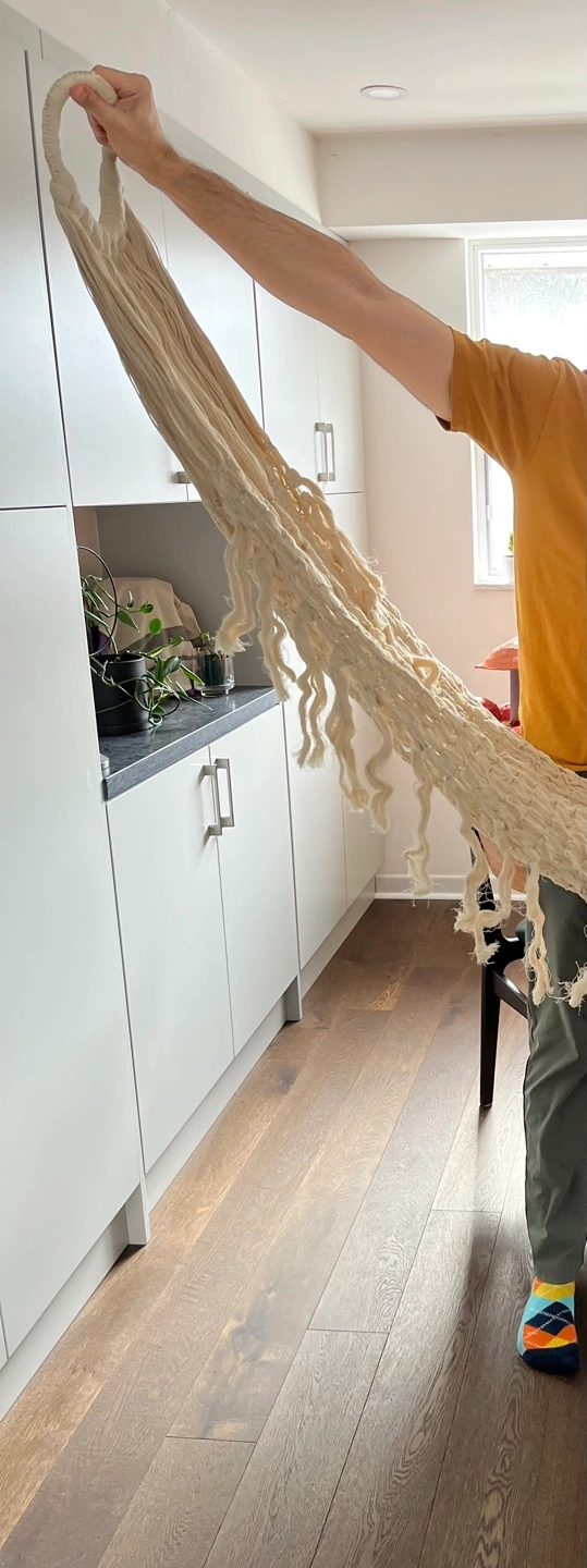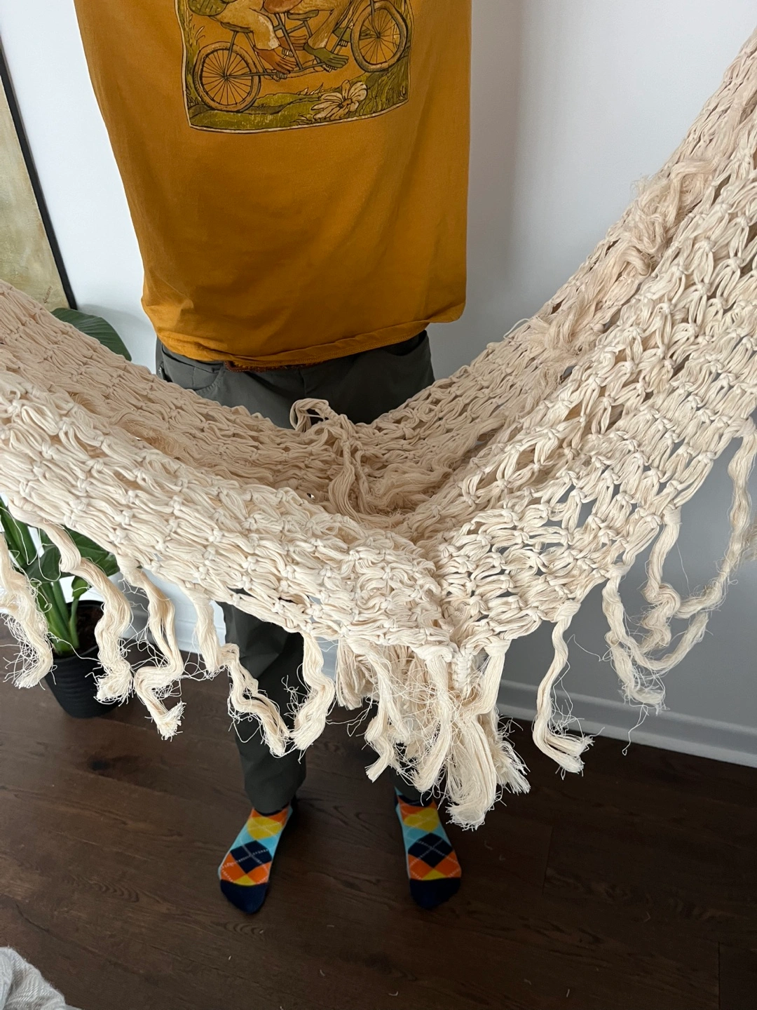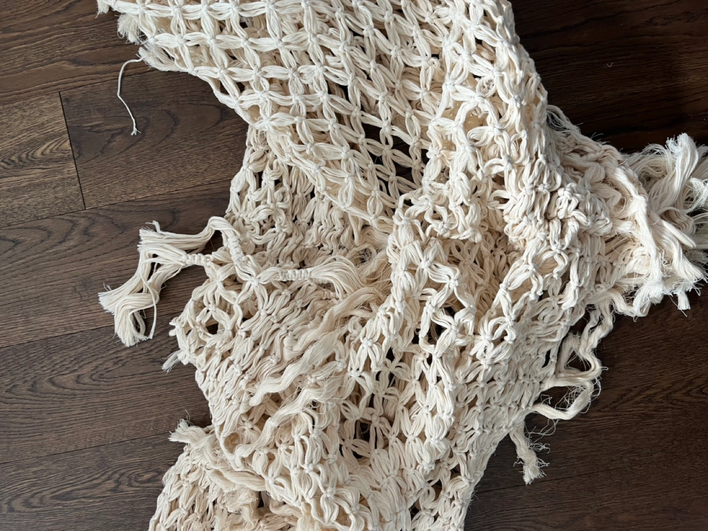 Cream-coloured macrame hammock. Features a unique knotted design and long fringe. Perfect for adding a bohemian touch to your home. Unassembled. Could be used for nice wedding decor too.