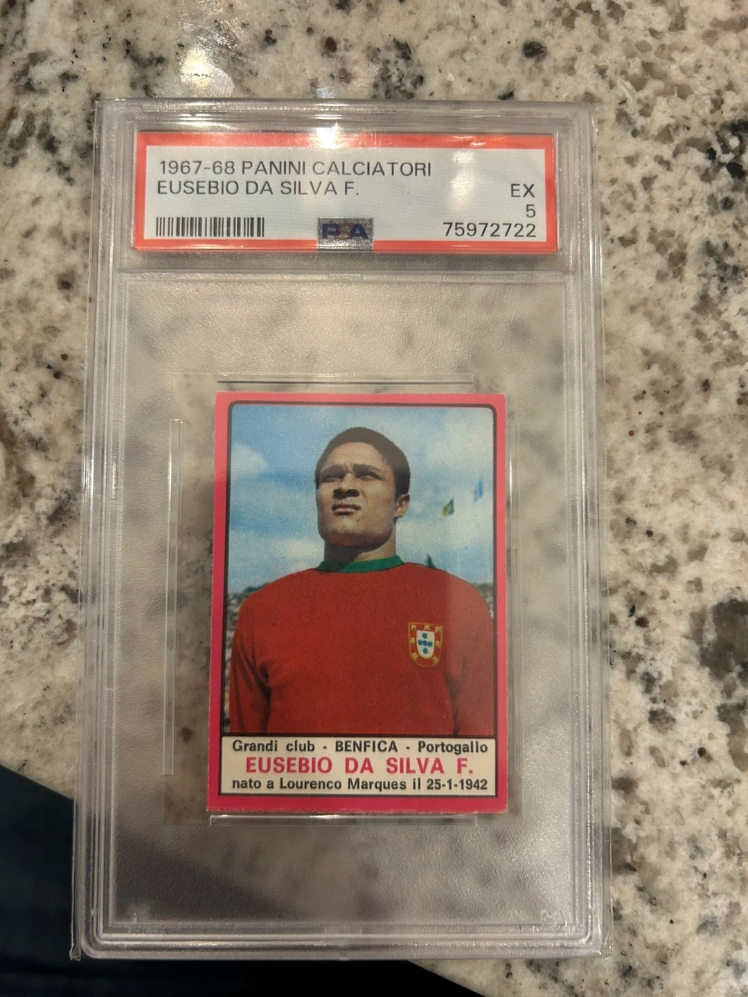 This is the 1967-68 Panini Calciatori card for Eusebio Da Silva F. It's graded EX 5 by PSA and has the serial number 75972722. The card details his career with Benfica and Portugal.