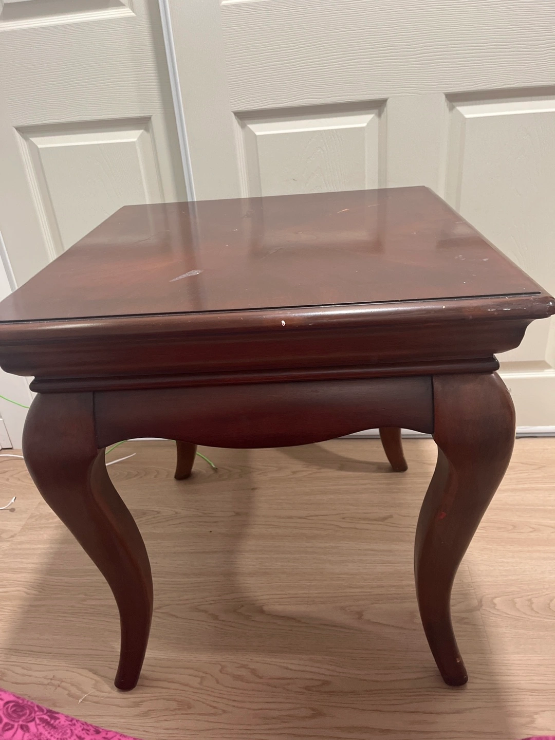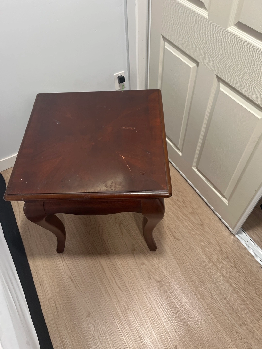 Square shaped side table. Features curved legs. Dark brown colour. A great side table to keep a cup of tea next to while you relax.