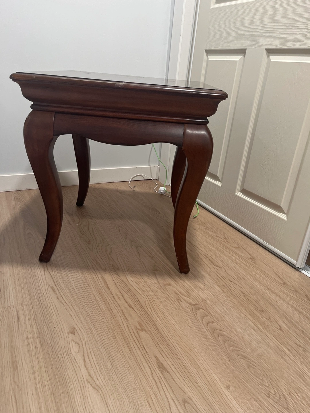 Square shaped side table. Features curved legs. Dark brown colour. A great side table to keep a cup of tea next to while you relax.