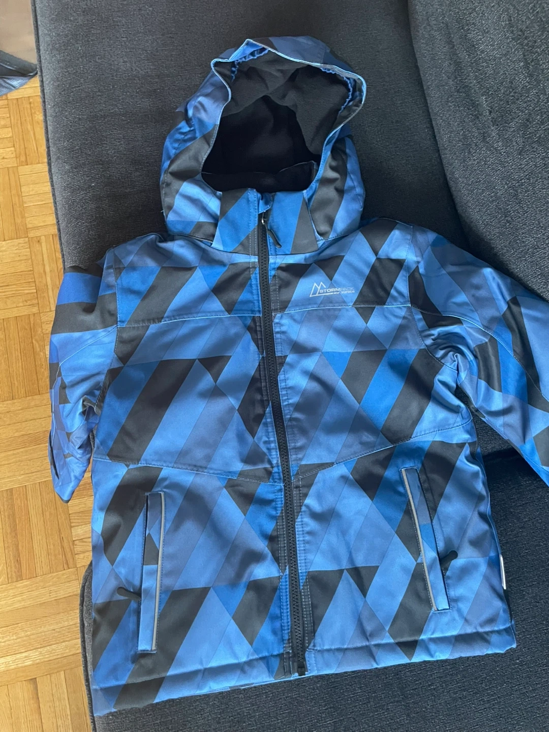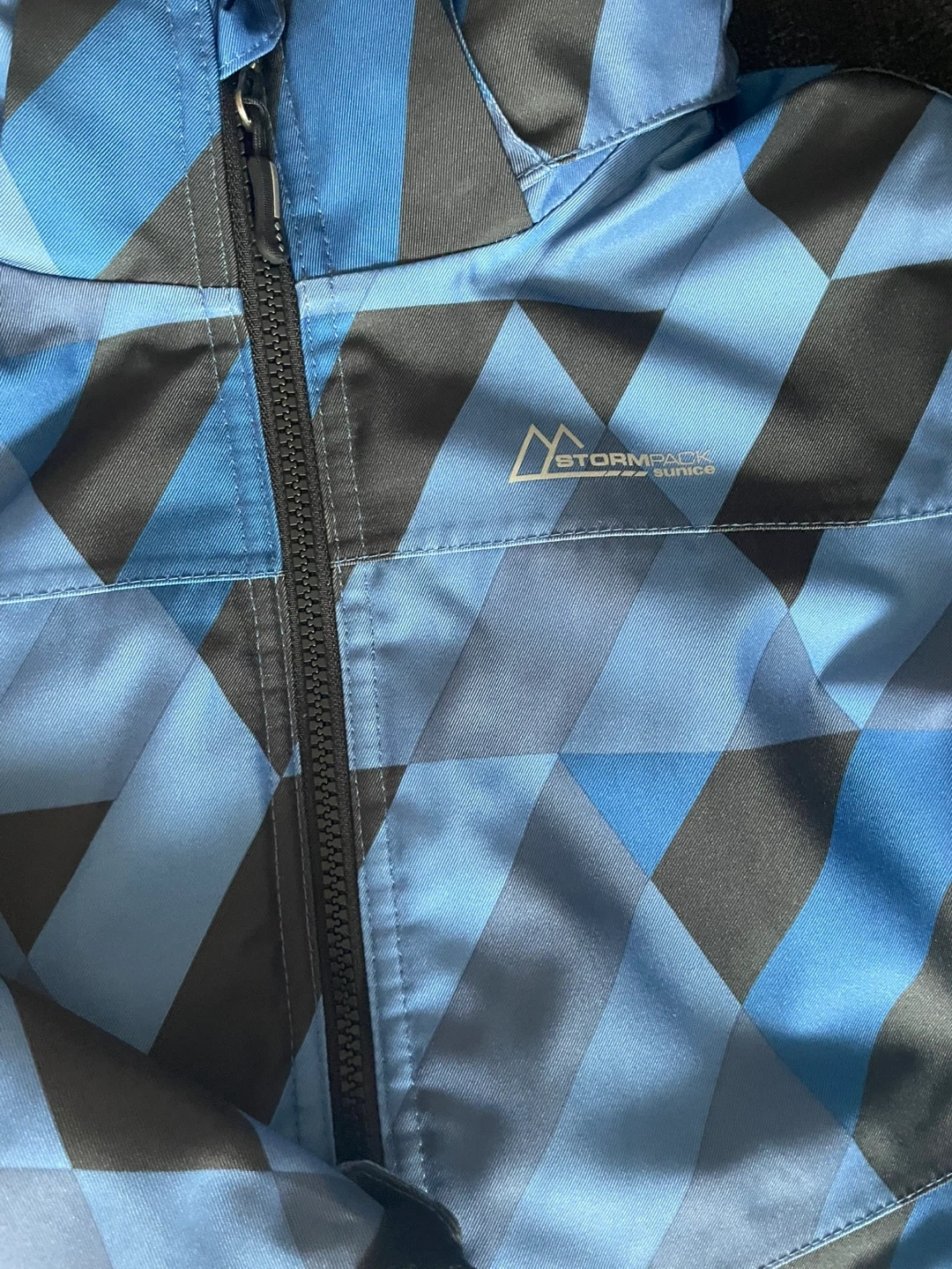 This boys' Stormpack Sunice jacket is blue with a cool geometric pattern. It's a size 6, perfect for keeping your little one warm. Worn just twice .It has a full zip front and a cozy hood.