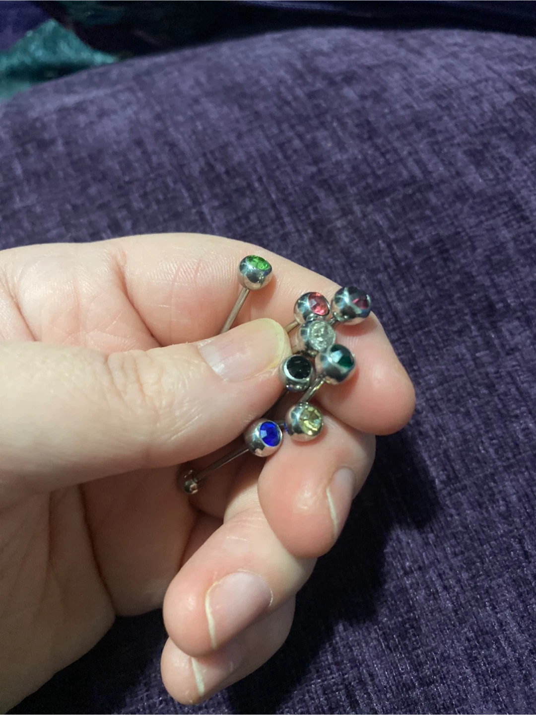 Set of 9 assorted tongue piercings with colourful gemstone tops. Each rod is made of silver-tone metal. These are great for personalizing your look!