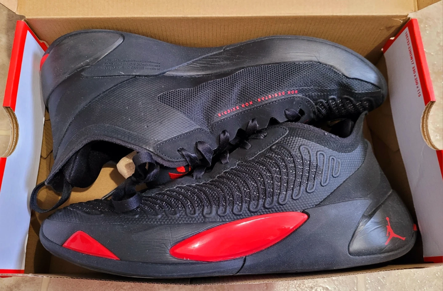 Men's black Nike Jordan basketball shoes with red accents. Features a breathable mesh upper and supportive sole. No Box