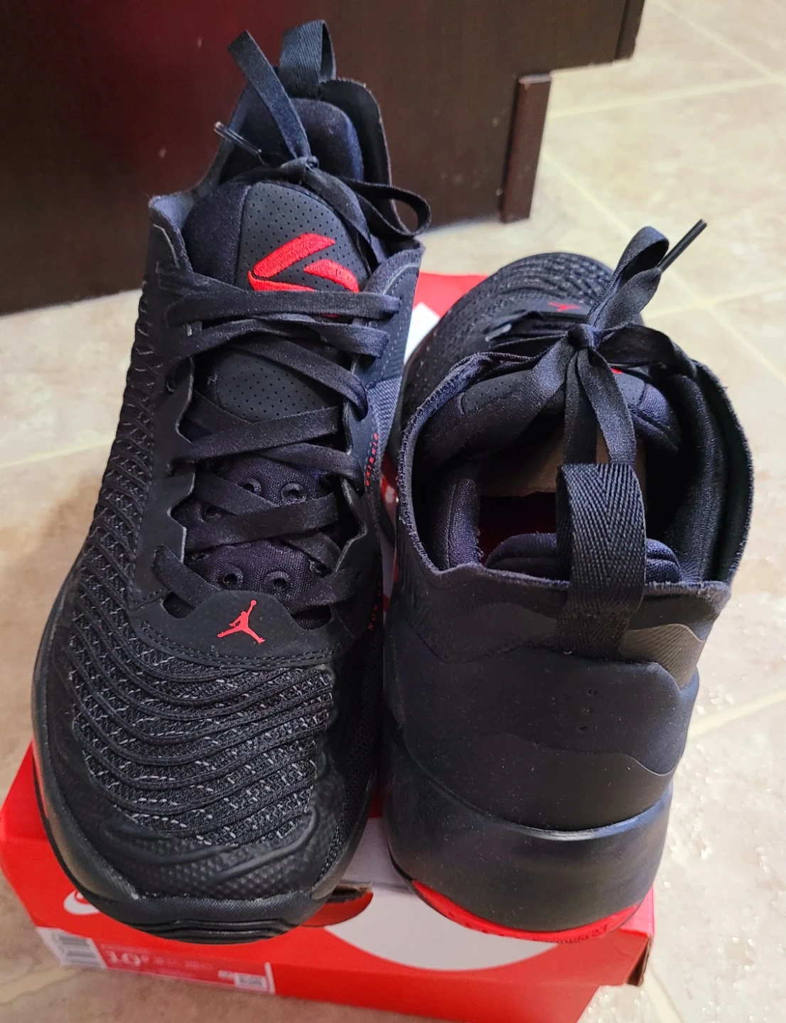 Men's black Nike Jordan basketball shoes with red accents. Features a breathable mesh upper and supportive sole. No Box