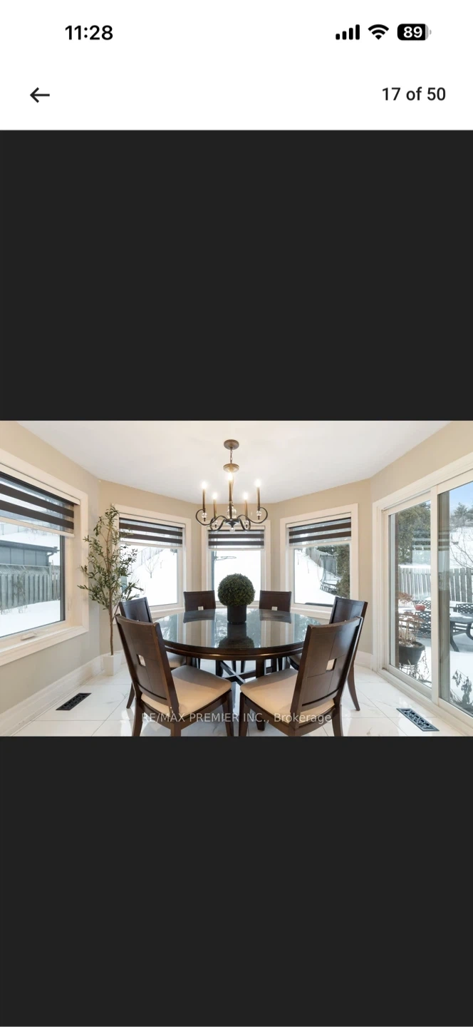 Round glass-top dining table with a dark wood base and six upholstered chairs. This set includes a matching chandelier. It's perfect for family meals and entertaining guests.