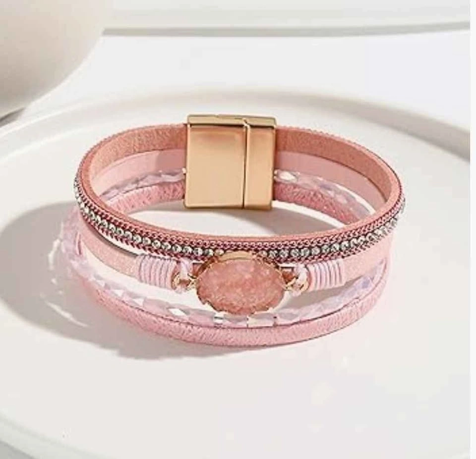 Leather Wrap Bracelet Boho Cuff Crystal Bead Clasp Jewelry