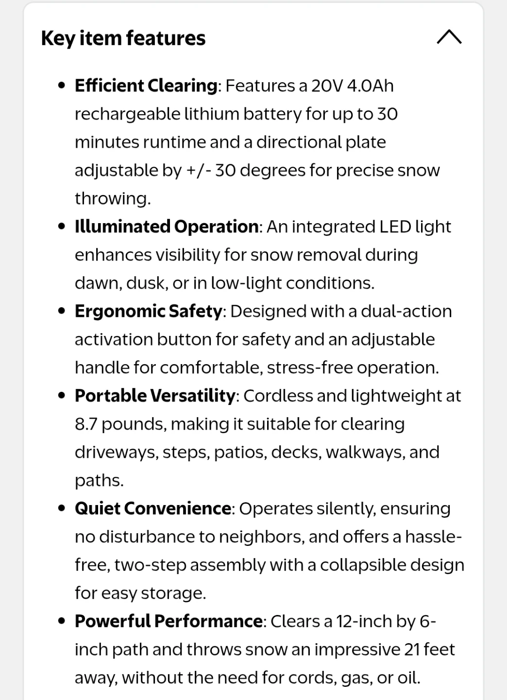 * Powerful Performance: Clears a 12-inch by 6-inch path and throws snow an impressive 21 feet away, without the need for cords, gas, or oil.