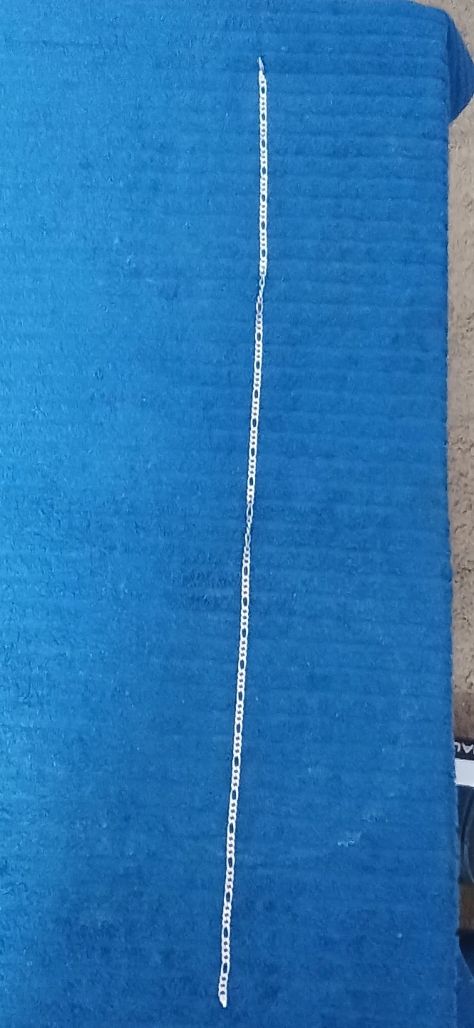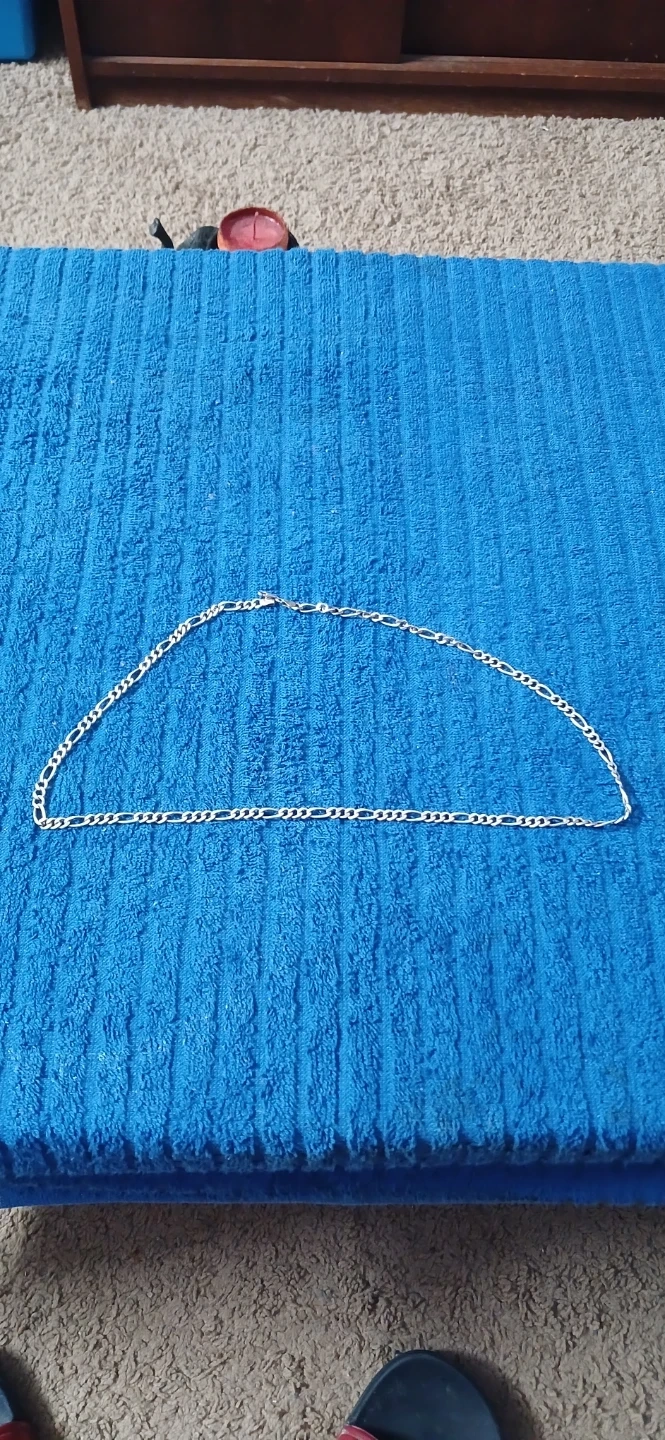 A silver Figaro chain necklace. It's a lovely accessory for everyday wear. Its simple design makes it versatile. This necklace would be a nice addition to any jewellery collection!