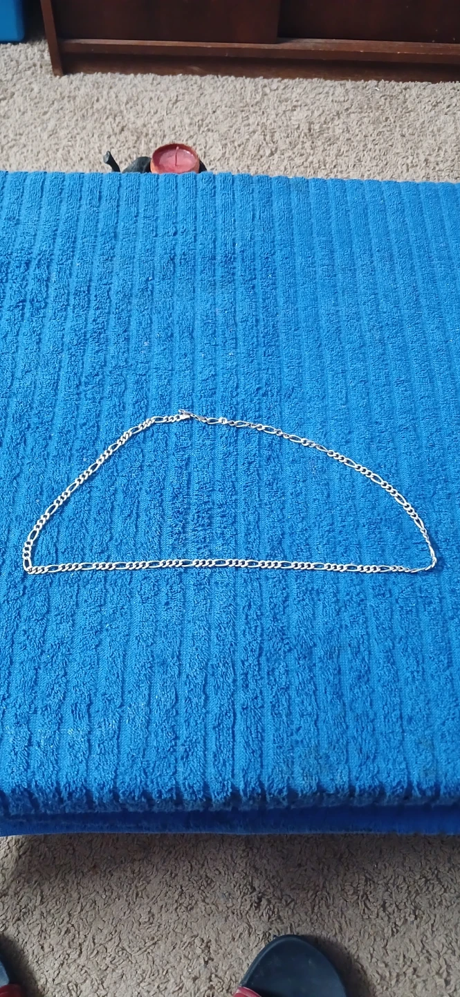 A silver Figaro chain necklace. It's a lovely accessory for everyday wear. Its simple design makes it versatile. This necklace would be a nice addition to any jewellery collection!