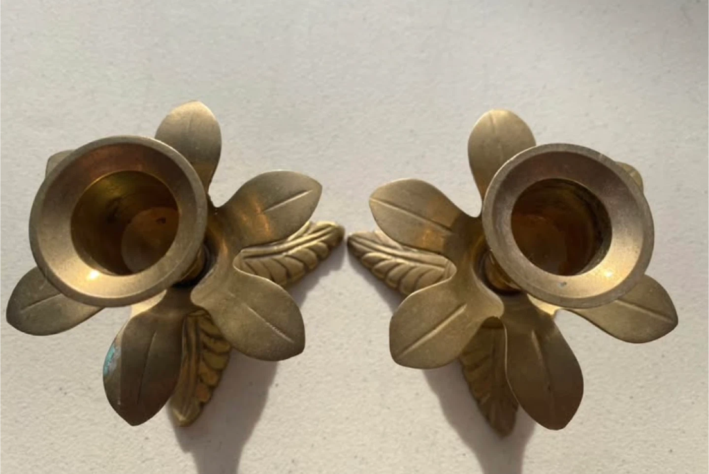 There is ever so slight patina on the one leaf please see the pictures. But I didn’t want to polish them before sale I think it adds special character :)