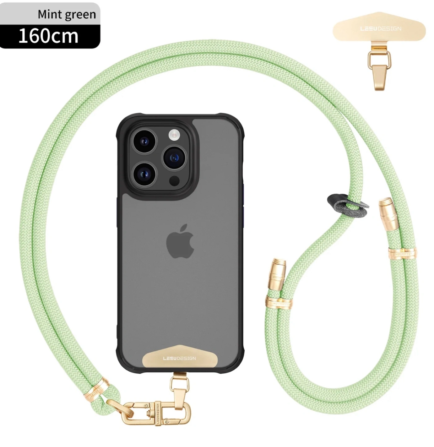 This is a LEEU DESIGN phone lanyard in mint green. It measures 160cm in length. It's perfect for keeping your phone secure and accessible!