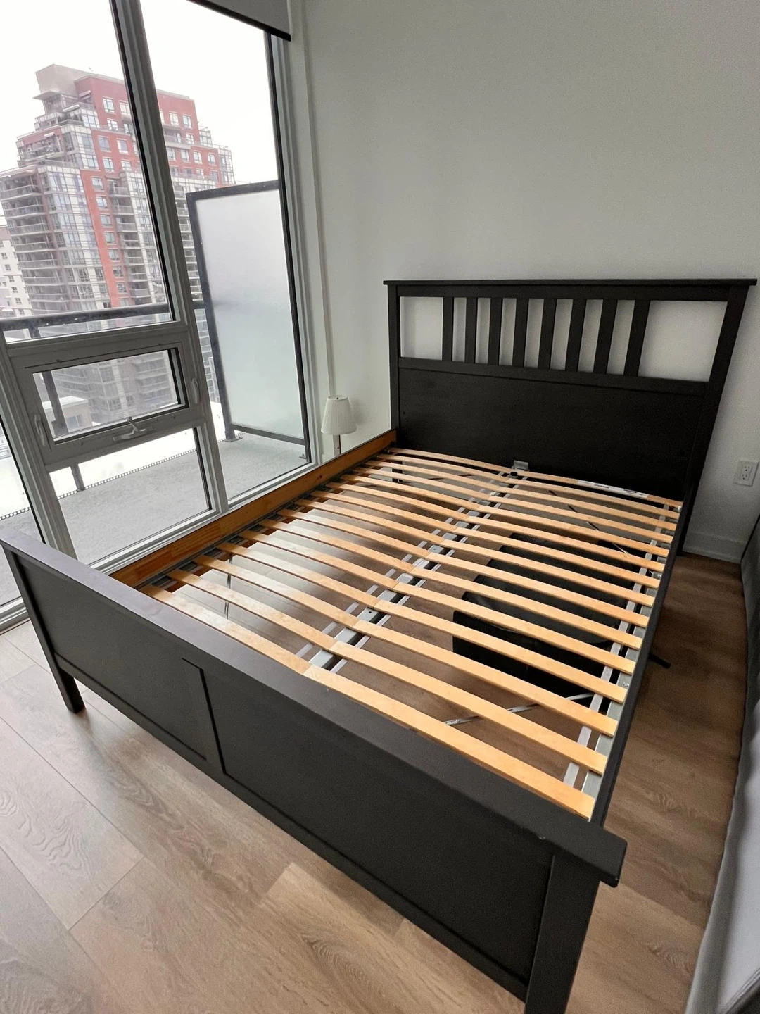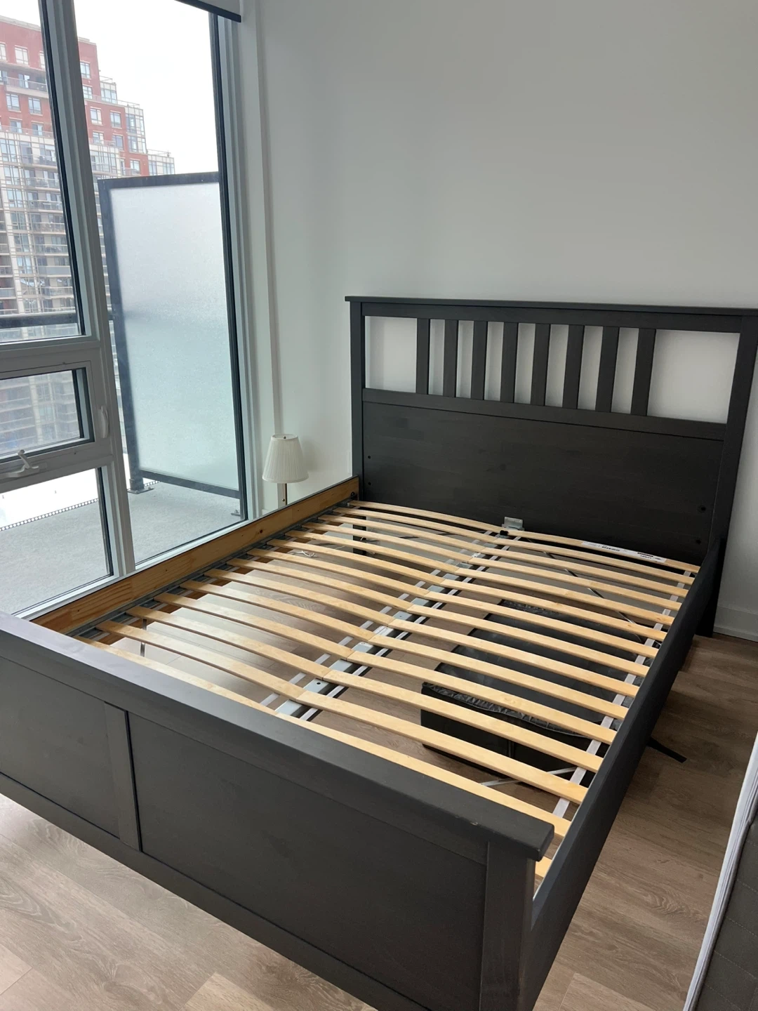 Selling a queen sized bed frame in dark gray! It's in great condition and ready for a new home. Perfect for adding a touch of modern style to your bedroom