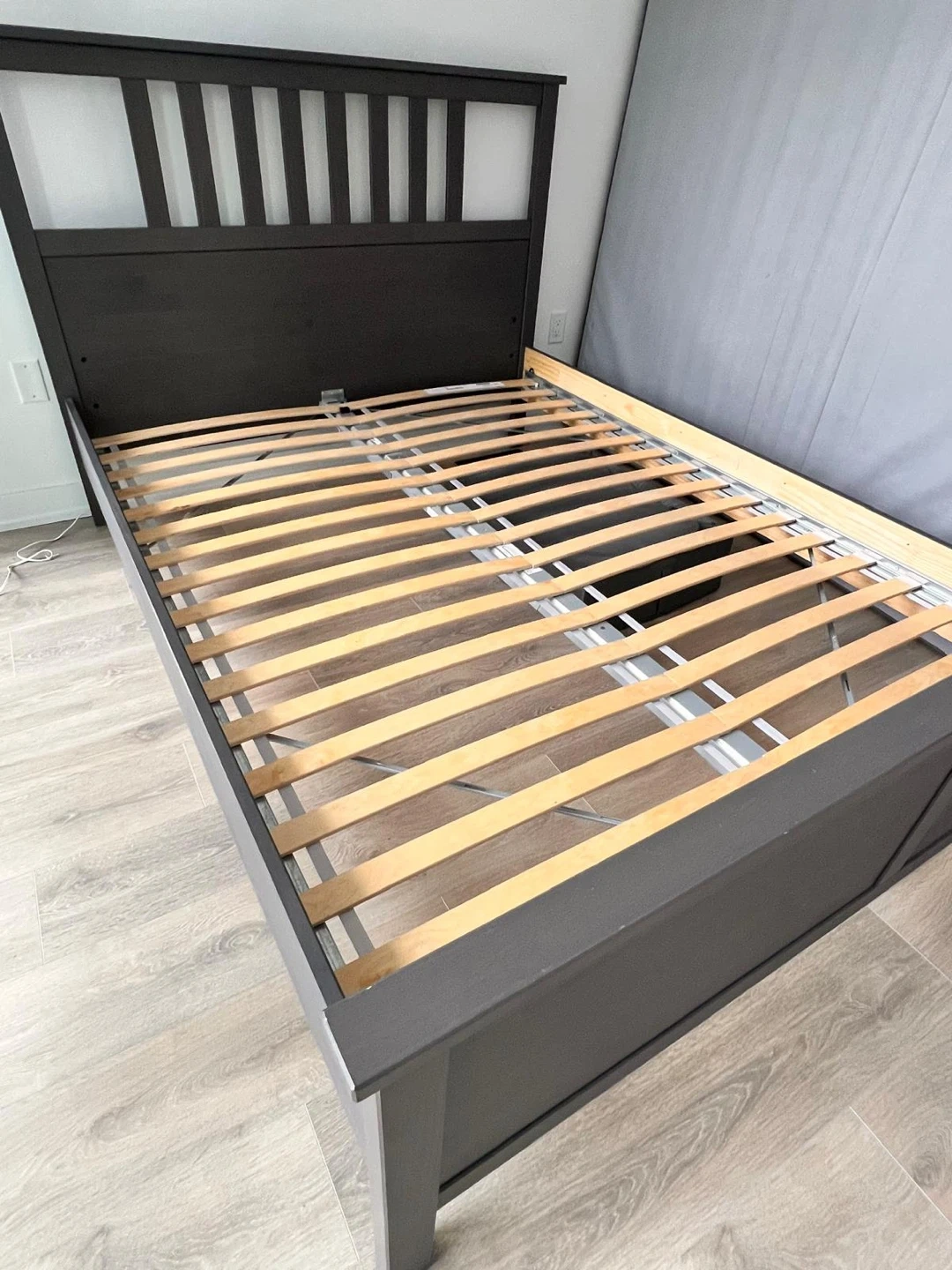 Selling a queen sized bed frame in dark gray! It's in great condition and ready for a new home. Perfect for adding a touch of modern style to your bedroom