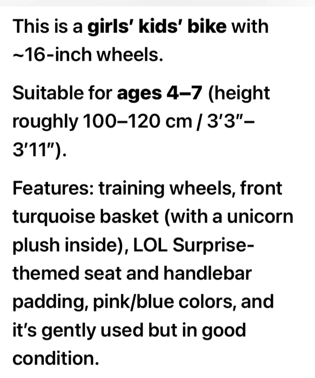 This is a kids bike with 16 inch wheels, suitable for ages 4_8 ( height roughly100-120 cm