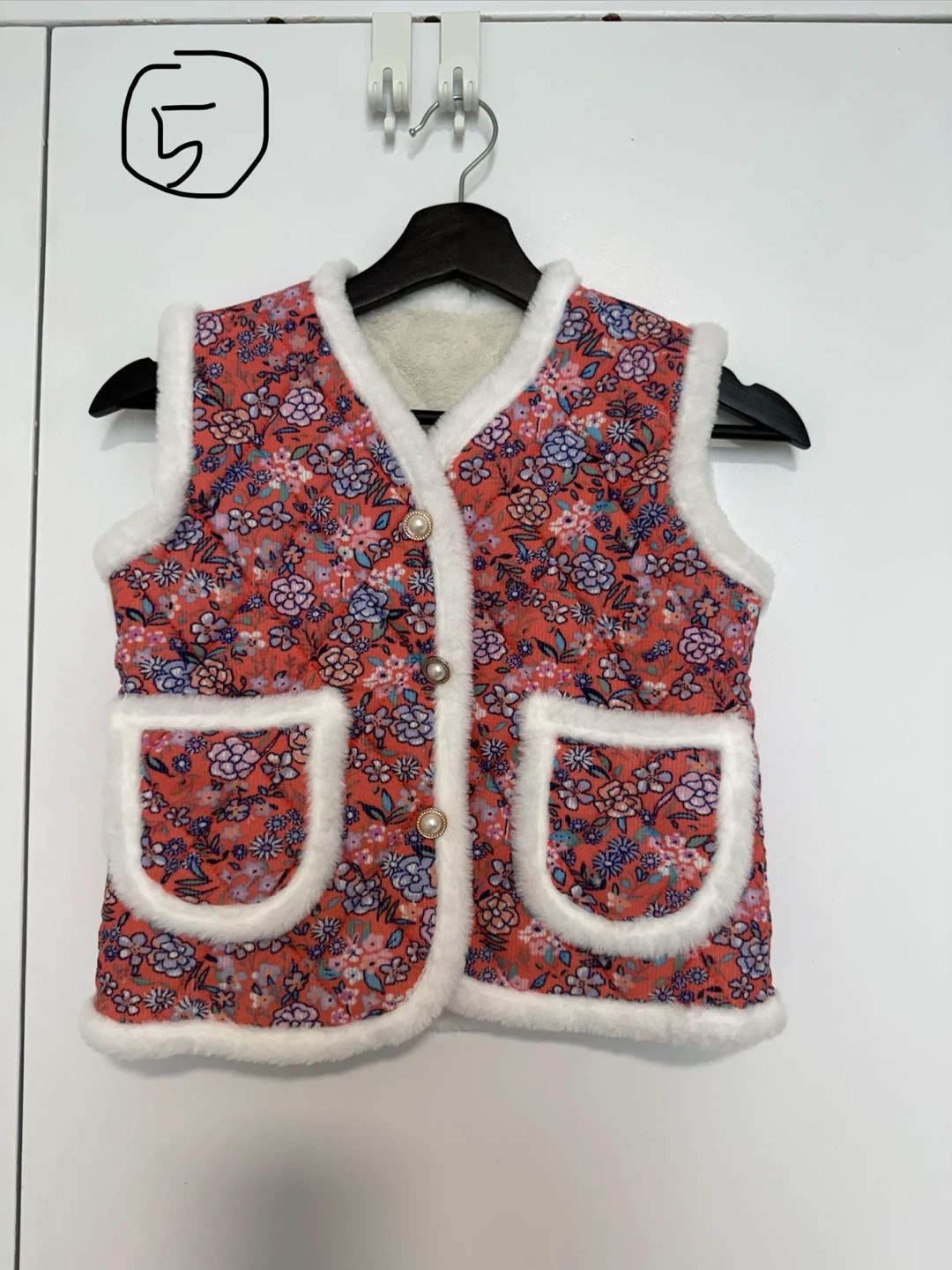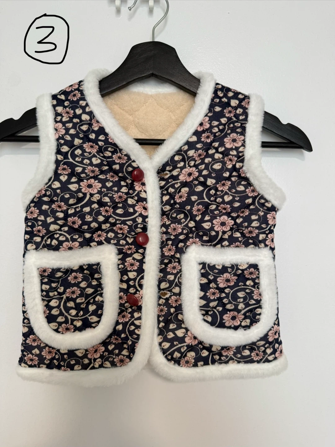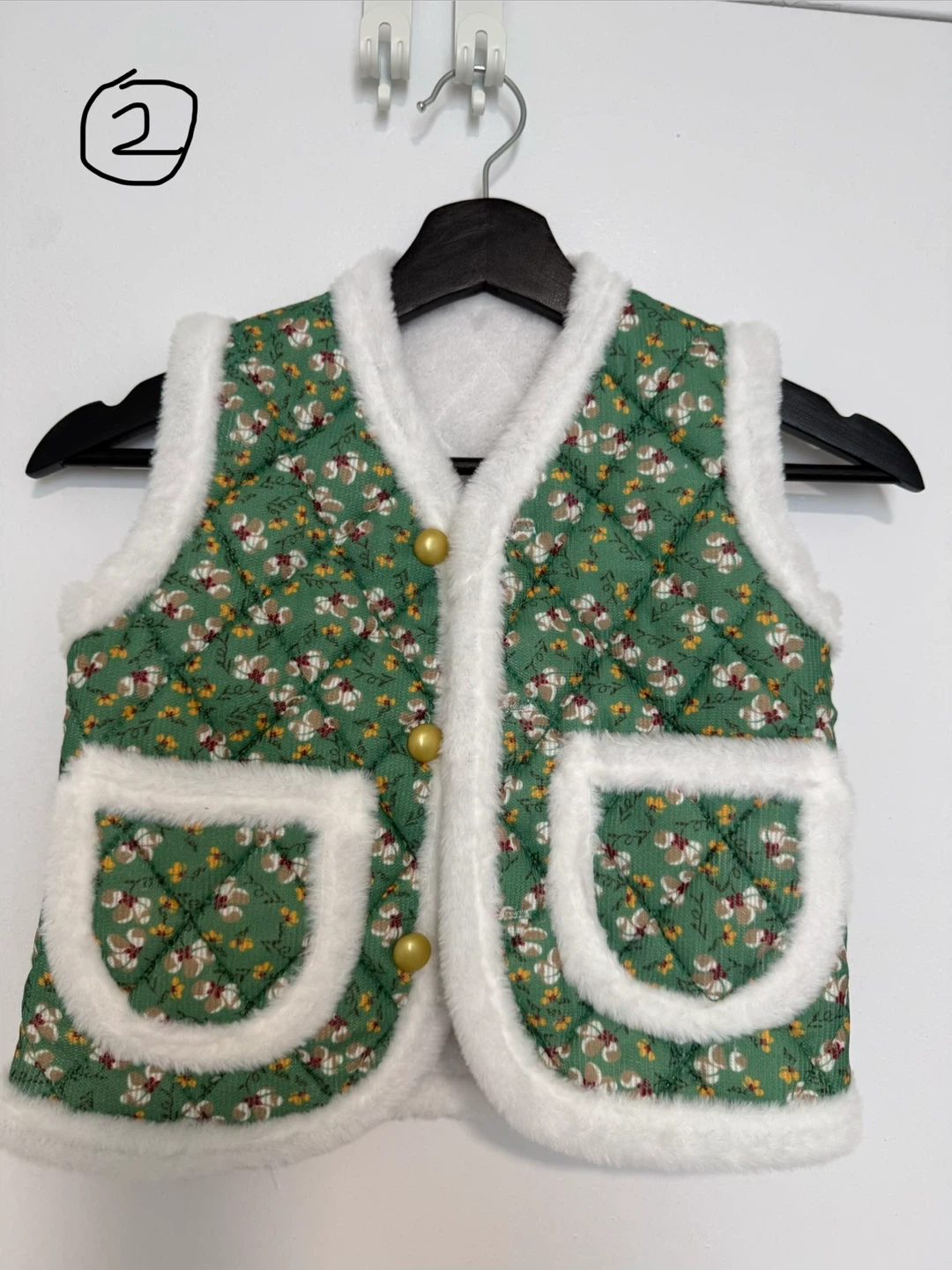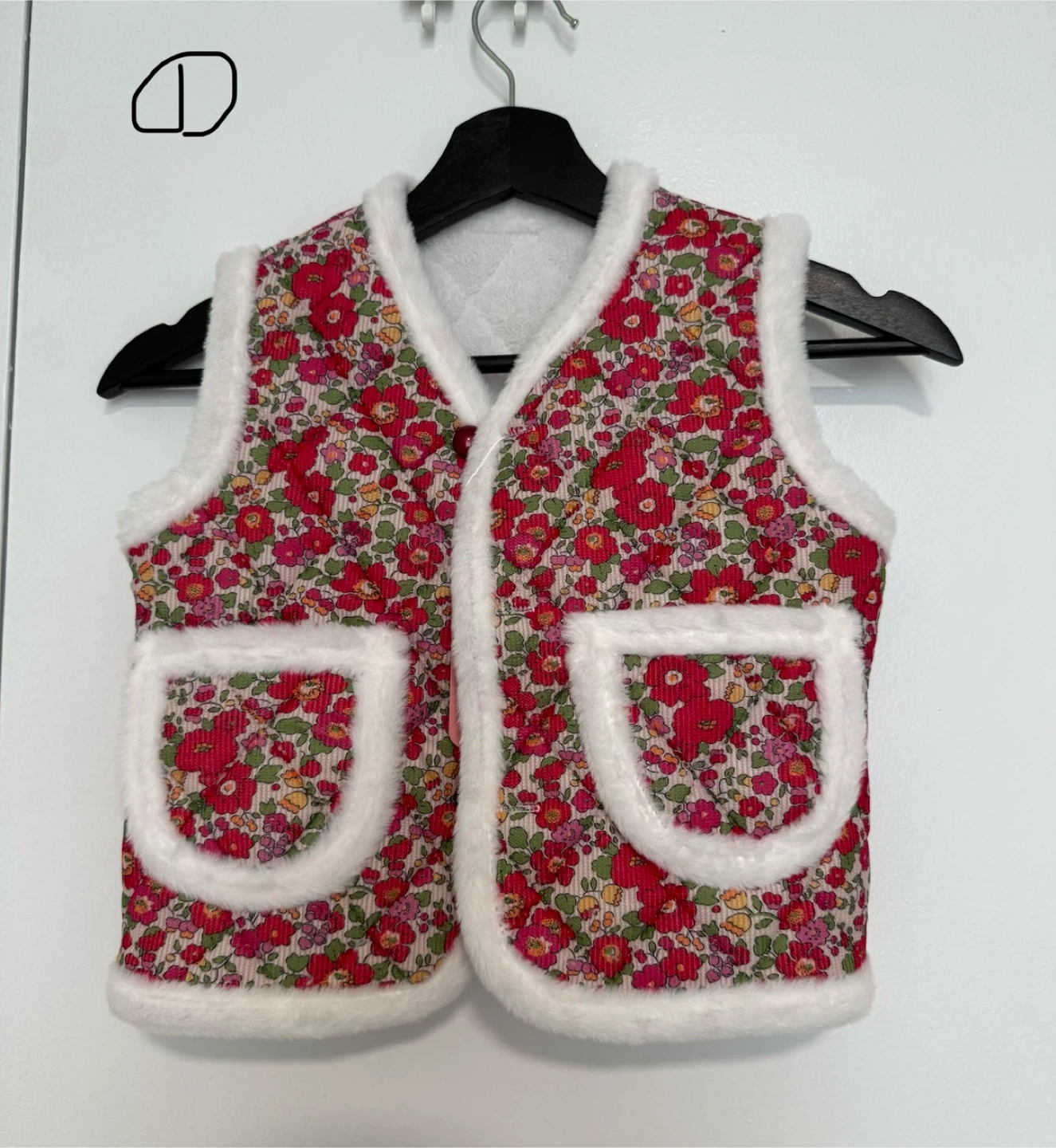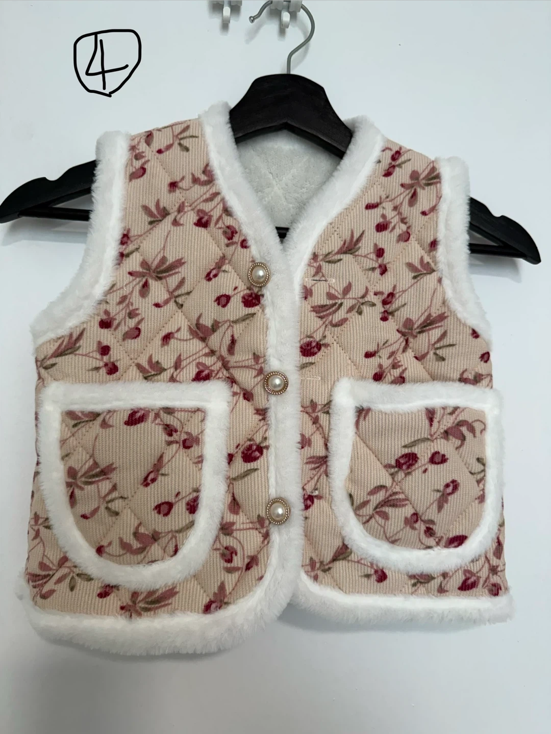 This quilted vest features a cozy rabbit fur trim and a floral print. It has two front pockets and a button-up front. It's a stylish layering piece for cooler days.
