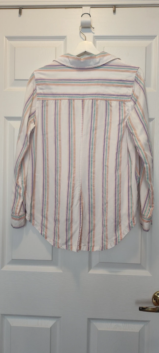 A Standard Grace collared pullover shirt with a pastel stripe pattern. It's with a relaxed fit and front pockets. This shirt is made of a lightweight fabric, perfect for casual wear.