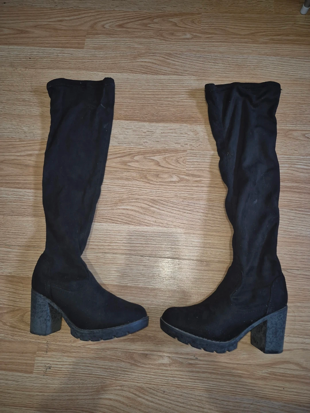These black over-the-knee boots feature a comfortable stretch fabric and a sturdy block heel. They have a textured sole for grip. These boots are great for adding a stylish touch to any outfit during cooler weather!