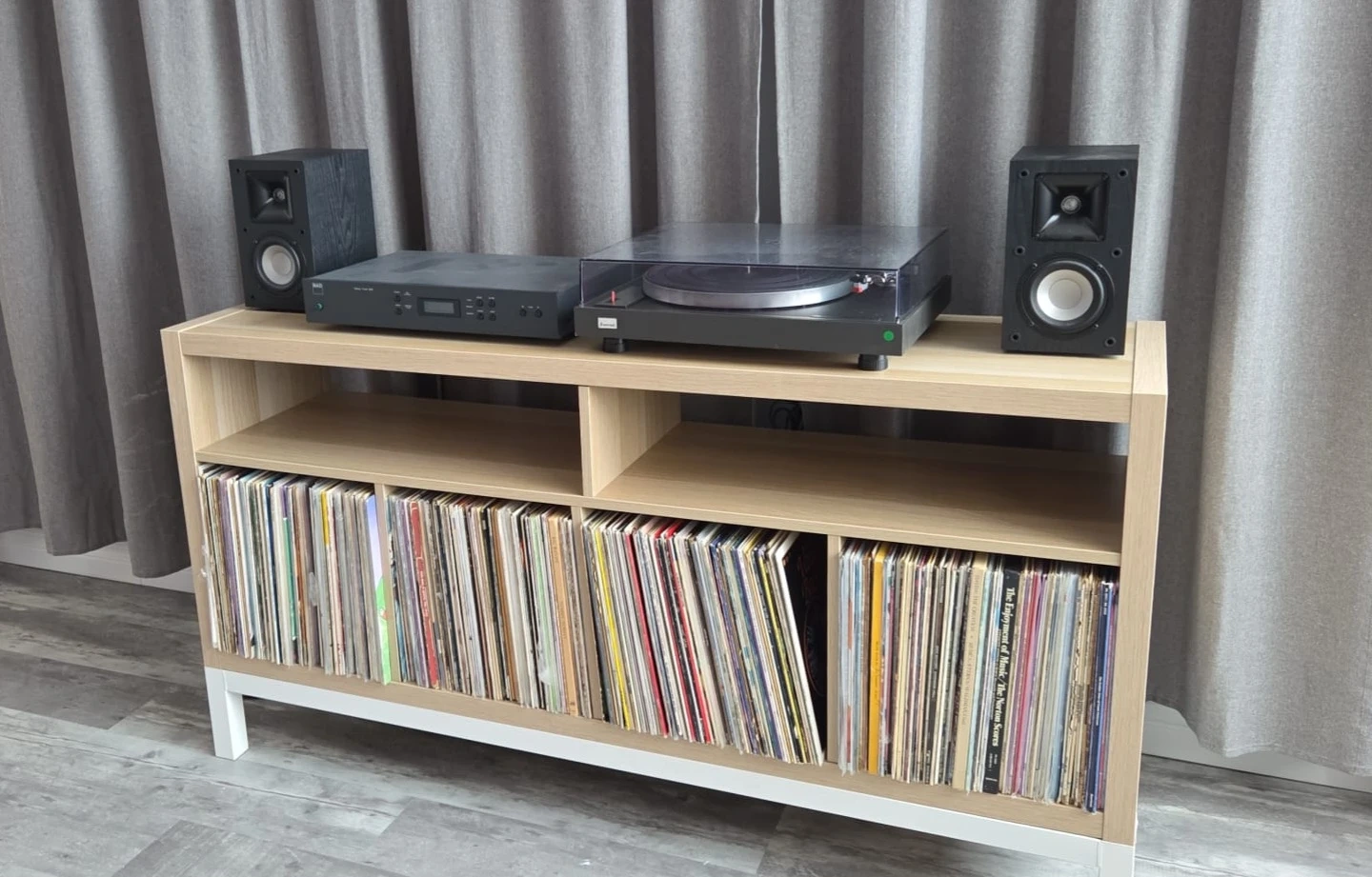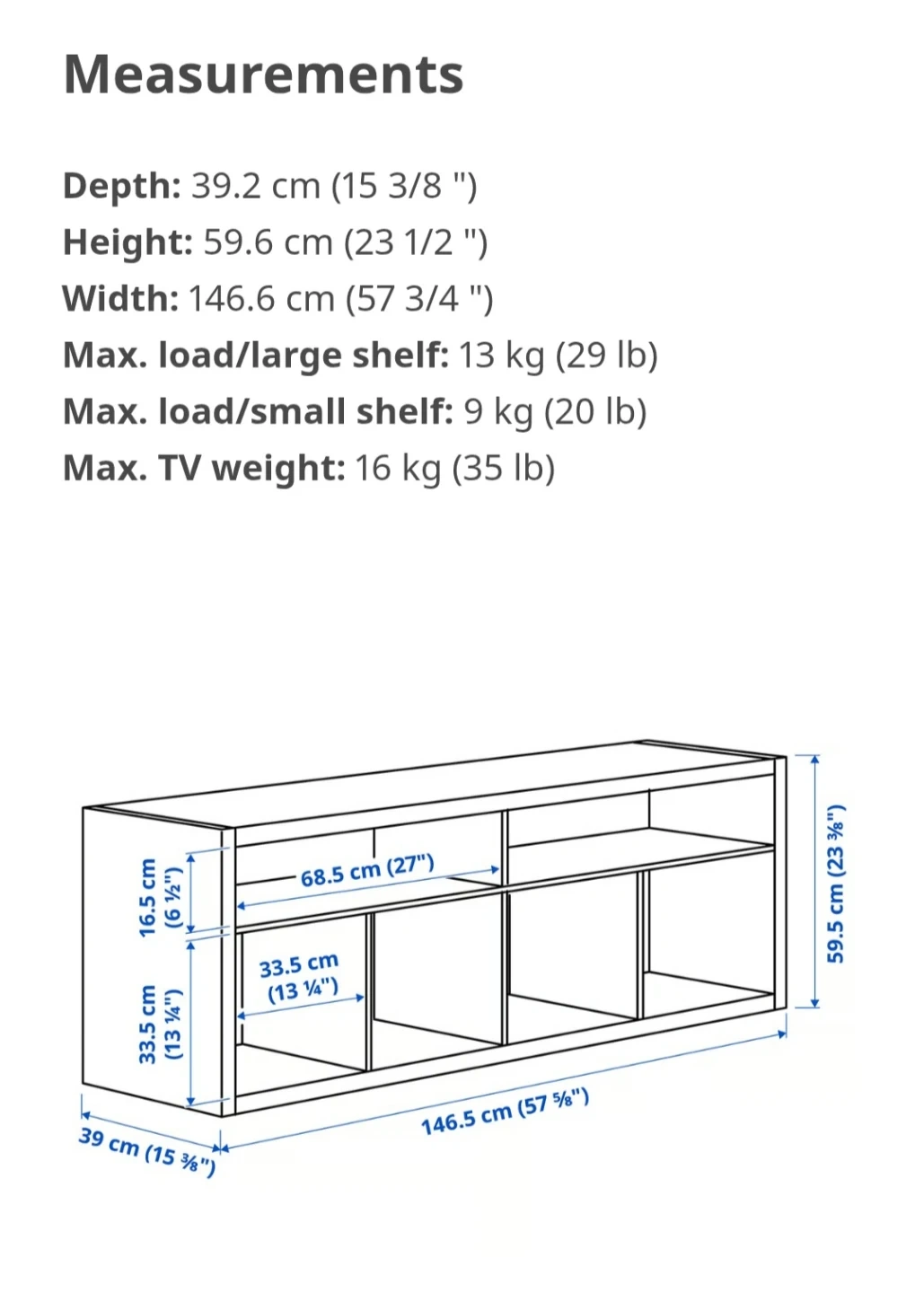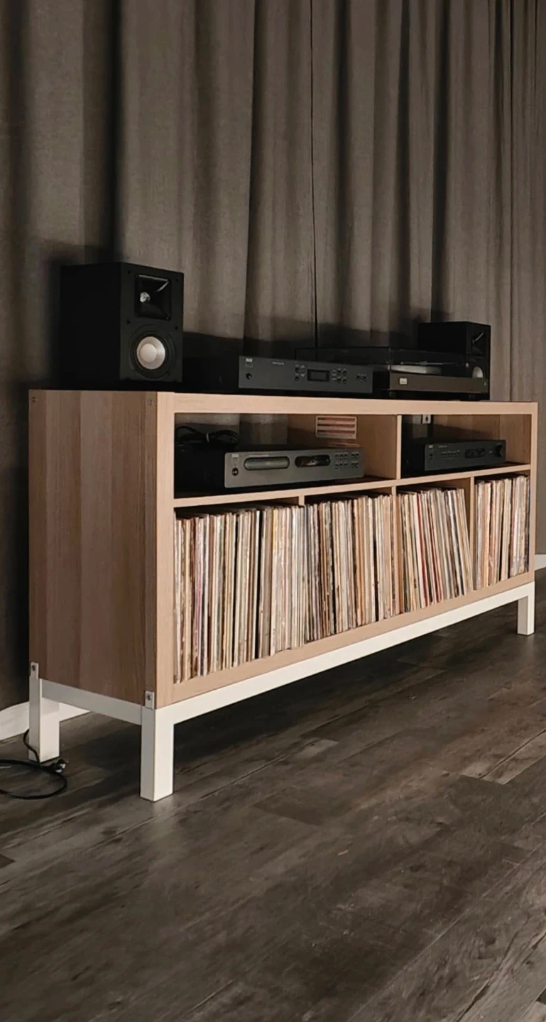 This TV bench / media stand is designed to hold your electronics and perhaps a vinyl collection. It features two main shelves for media components and lower shelving for records. The wood and white metal construction offers a modern look. Measurements and details are in pictures 3 and 4.
