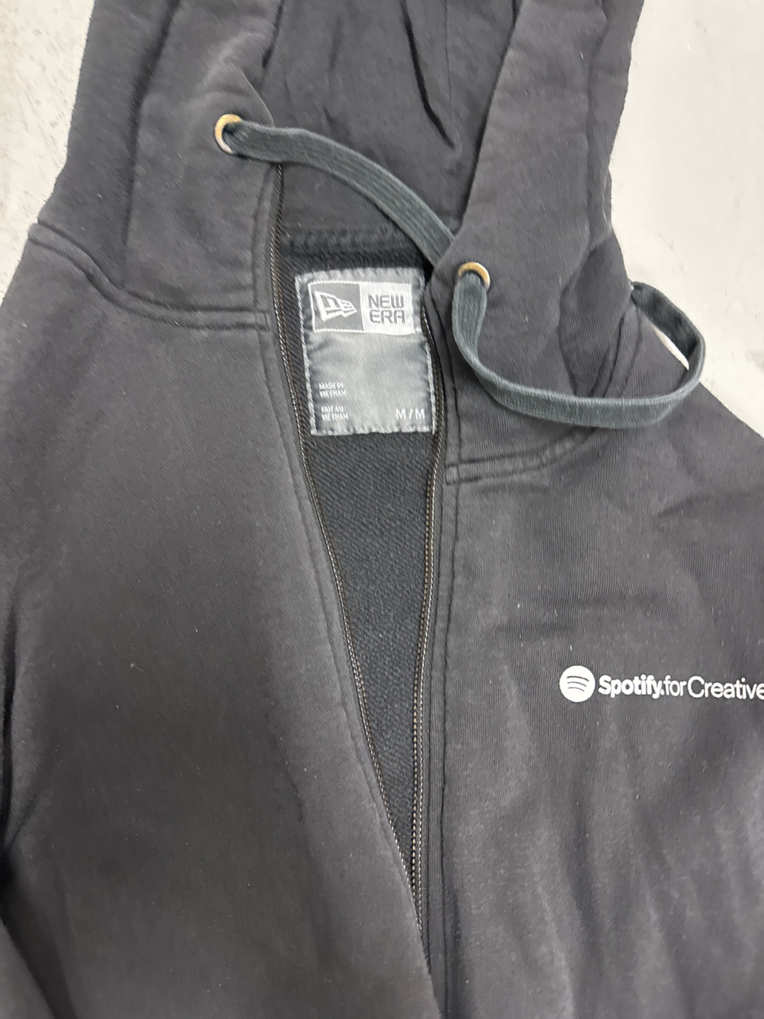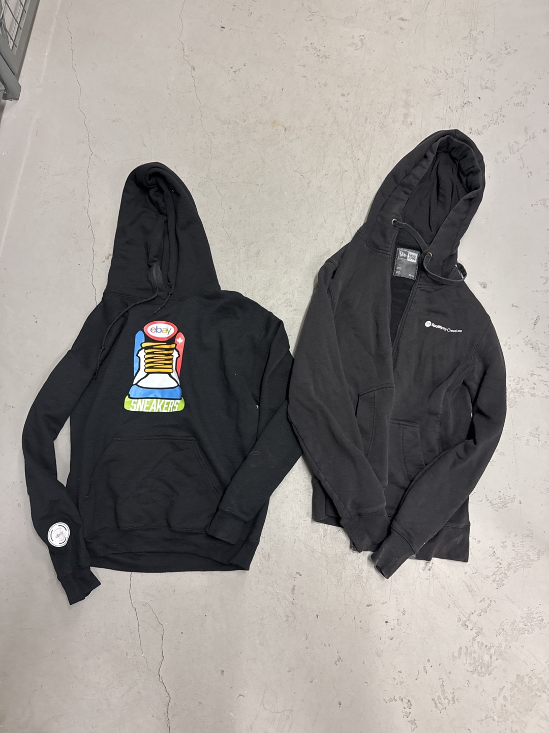 Bundle of two black hoodies. One pullover hoodie features a sneaker graphic. The other is a zip-up hoodie with a Spotify for Creative logo. Both appear to be in good condition.