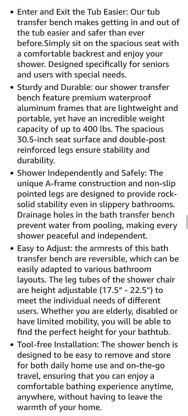 I am selling a Careboda tub transfer bench and shower chair designed for seniors. The bench is brand new. It comes with adjustable features including a backrest and soft arm support, and has a 400 lb weight capacity.