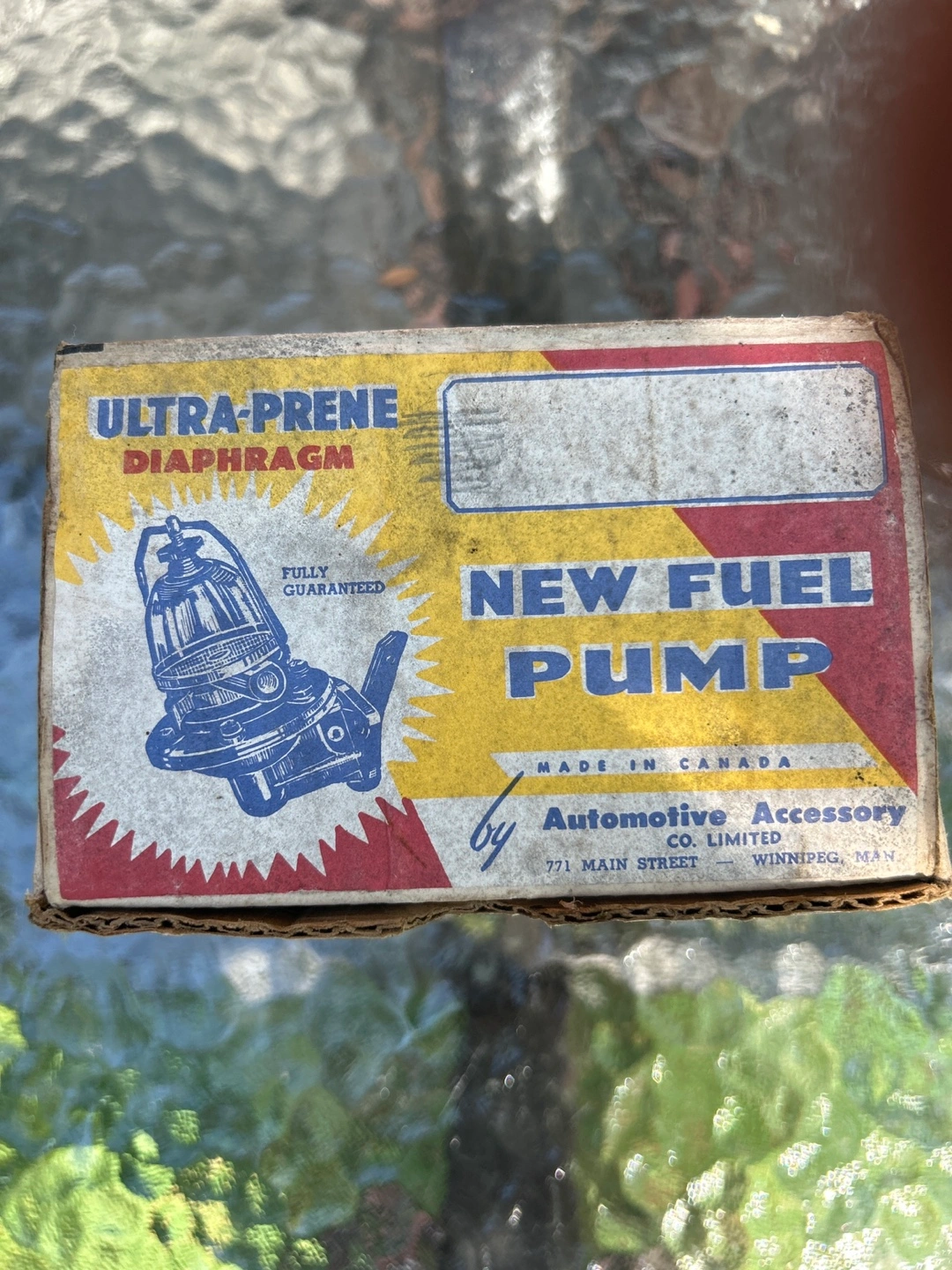 Selling a brand new fuel pump still in its original box! It's made in Canada by Automotive Accessory Co. Limited in Winnipeg. The box is also marked as being made by Domtar Packaging Limited, also in Winnipeg.