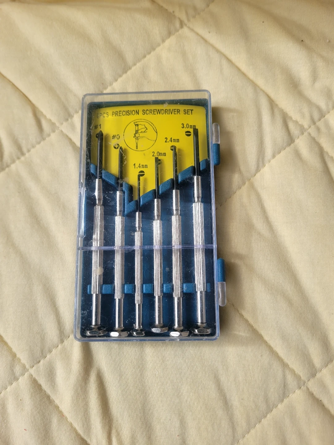 This is a 6-piece precision screwdriver set. It includes screwdrivers with tips of #1, #0, 1.4mm, 2.0mm, 2.4mm, and 3.0mm. They're housed in a clear plastic case.
