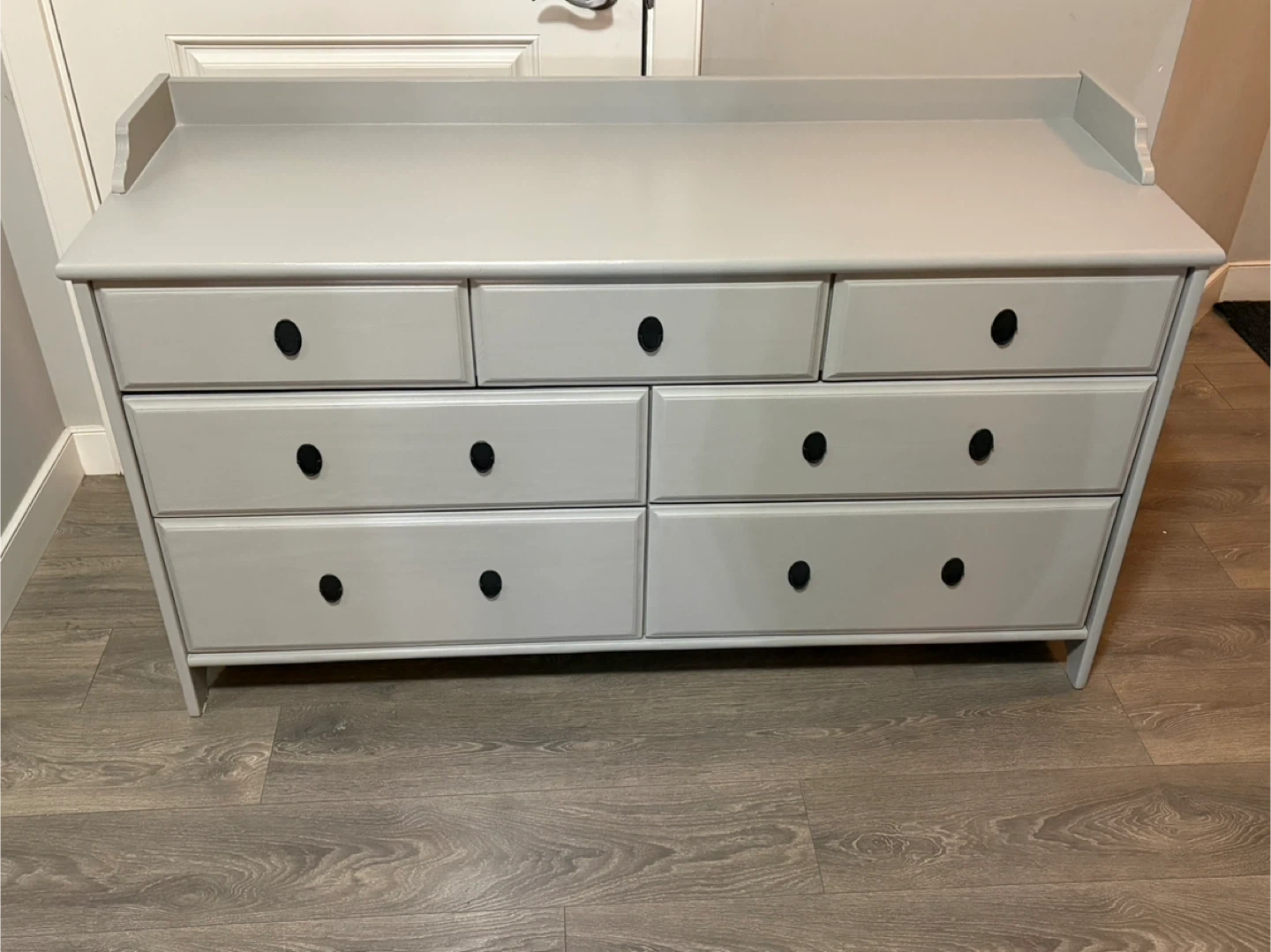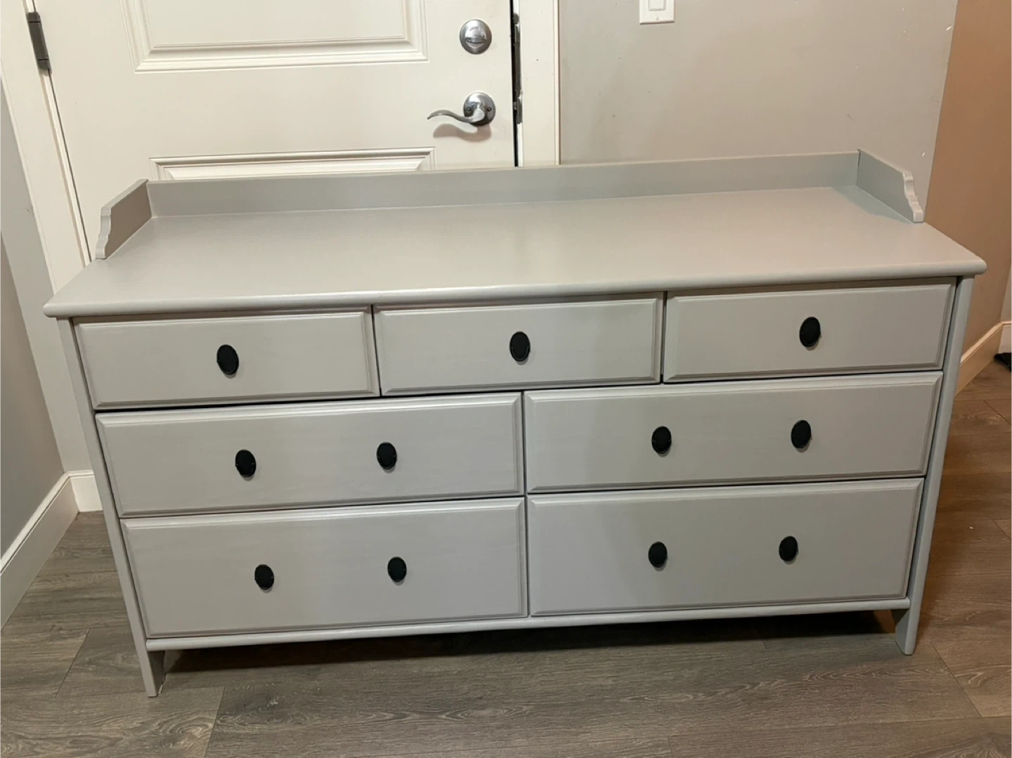 This stylish refinished grey dresser features seven drawers, perfect for organizing clothes and essentials. It is in great shape and ready for a new home. The drawers are very clean and slide smooth on rolls. All the drawers have new liners and very clean.