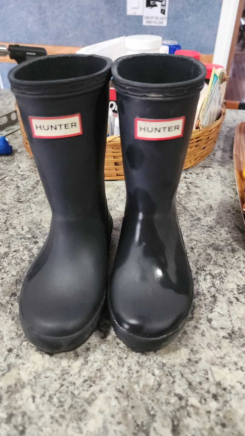 Hunter black rubber rain boots. These are kid-sized boots perfect for puddle jumping. They're made of durable, waterproof rubber. Paid 69 FOR THEM AT WINTERS
