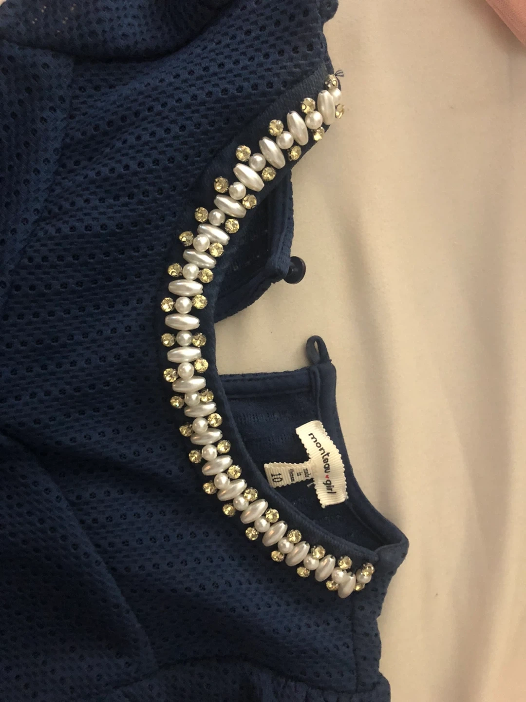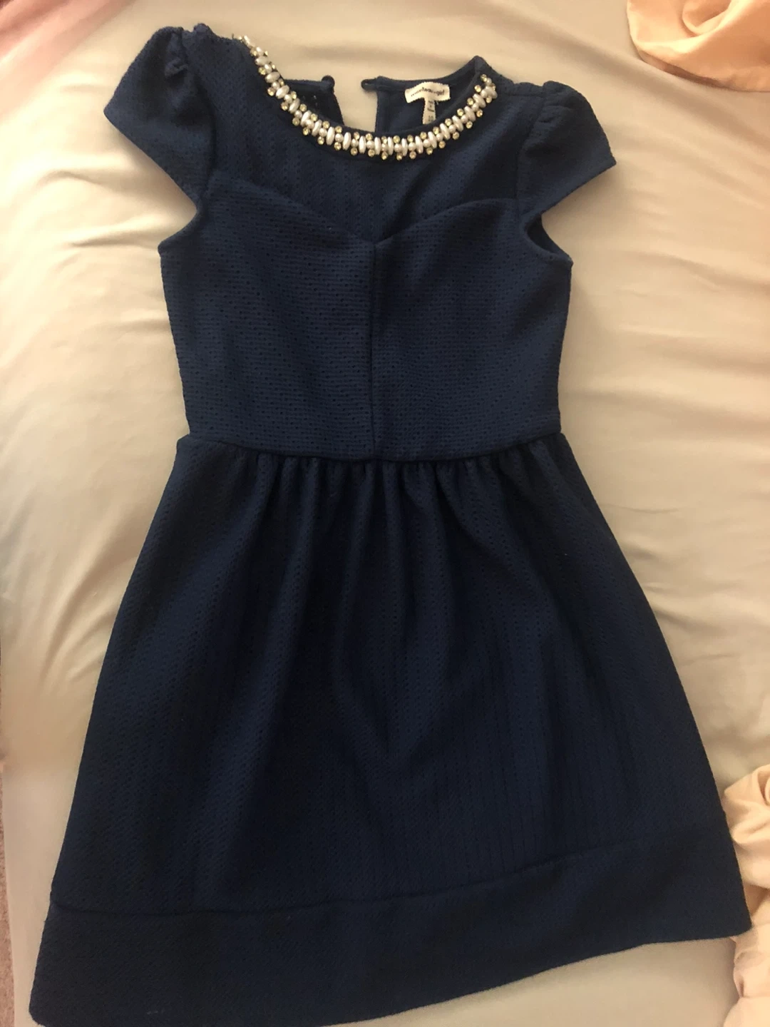 This navy blue dress from Montage Girl features a beautiful pearl and rhinestone embellished neckline. It has short, puffed sleeves and a flattering A-line skirt. Made with a textured fabric.