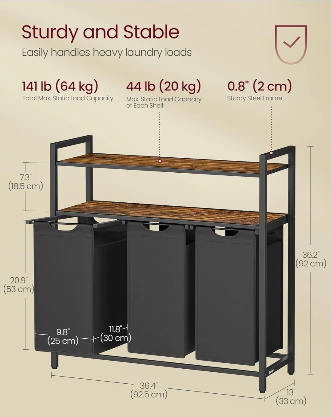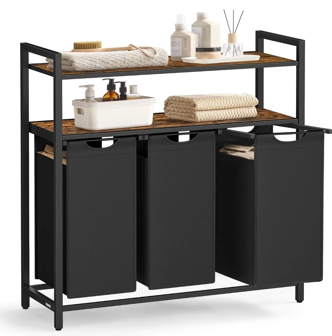VASAGLE laundry sorter by Songmics Home. It's 31.5 Gal. (120 L) capacity and features water-repellent fabric baskets with hook-and-loop fasteners. This unit has a sturdy steel frame and a load capacity of 141 lb (64 kg) total. It's great for organizing laundry.