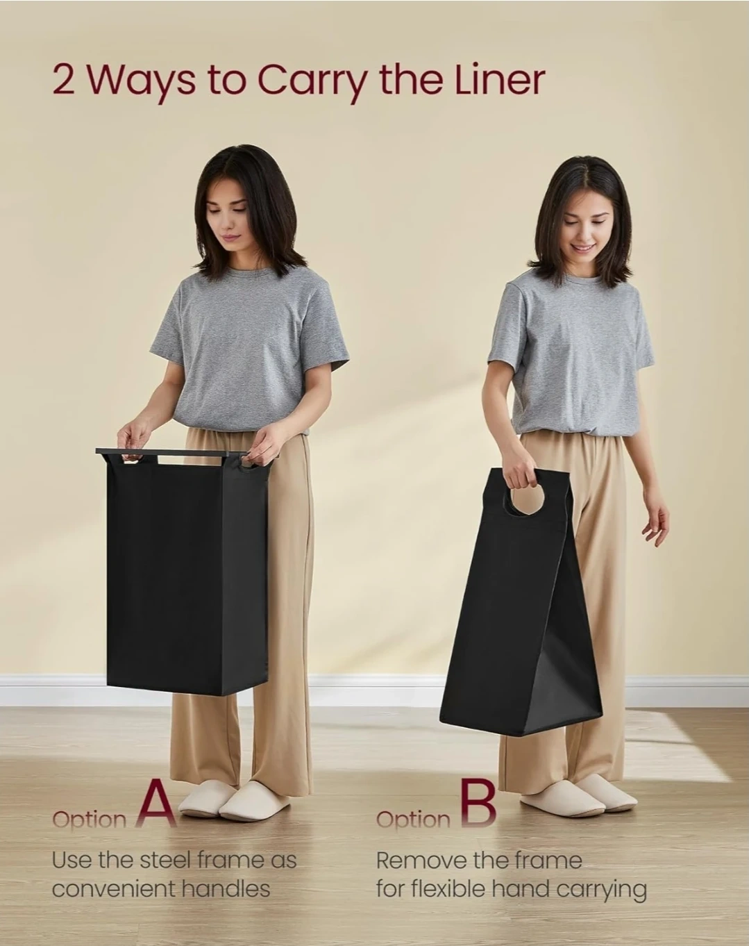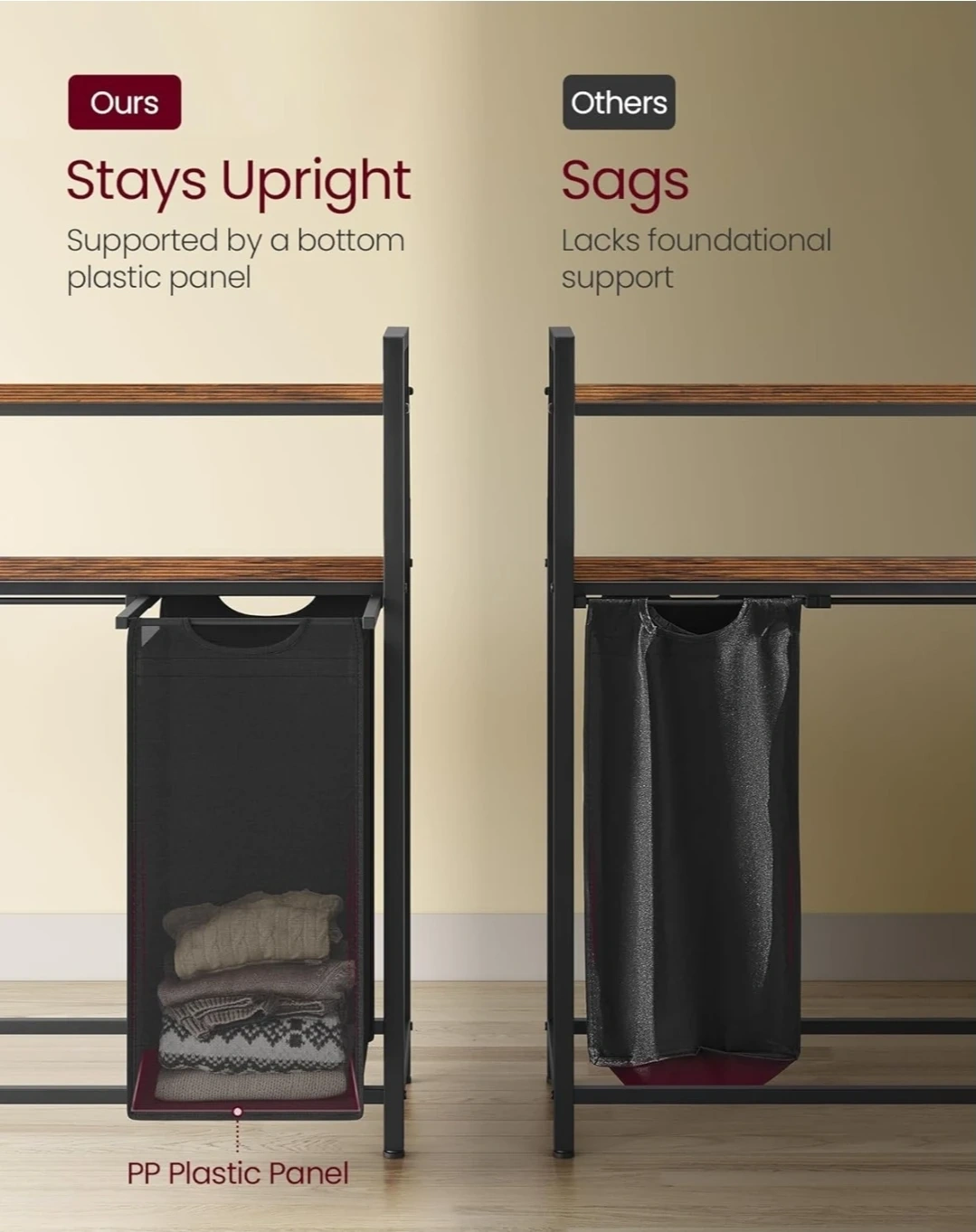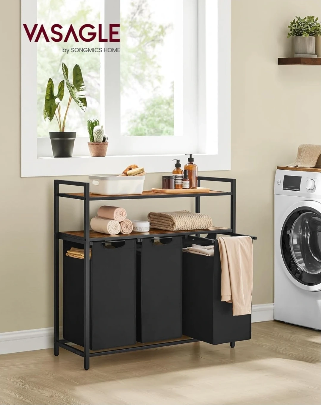 VASAGLE laundry sorter by Songmics Home. It's 31.5 Gal. (120 L) capacity and features water-repellent fabric baskets with hook-and-loop fasteners. This unit has a sturdy steel frame and a load capacity of 141 lb (64 kg) total. It's great for organizing laundry.