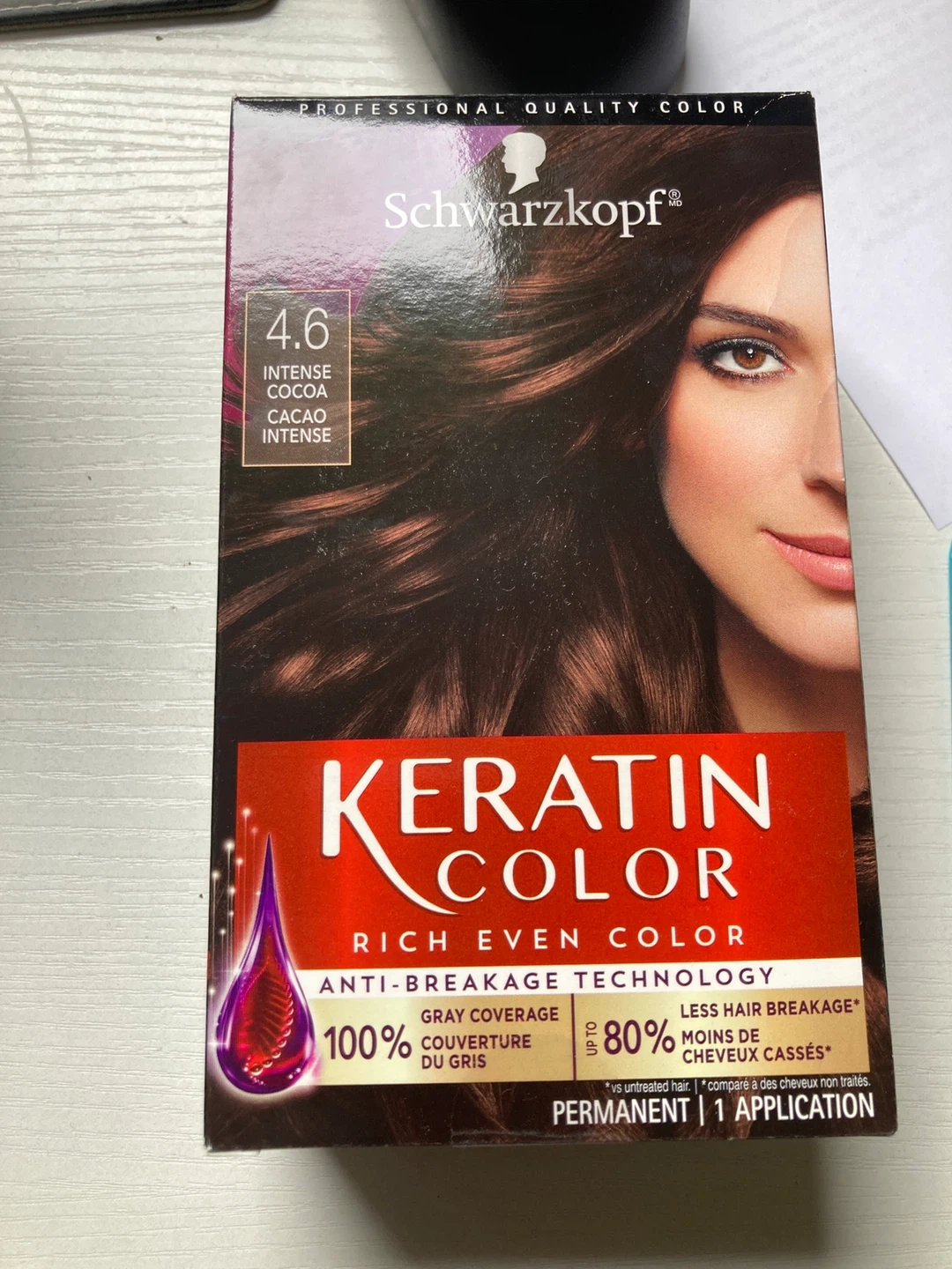 Schwarzkopf Keratin Color permanent hair dye in shade 4.6 Intense Cocoa. Offers rich, even colour with anti-breakage technology. Includes 100% gray coverage and up to 80% less hair breakage.