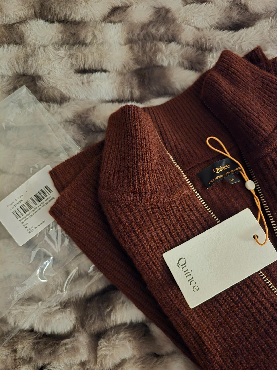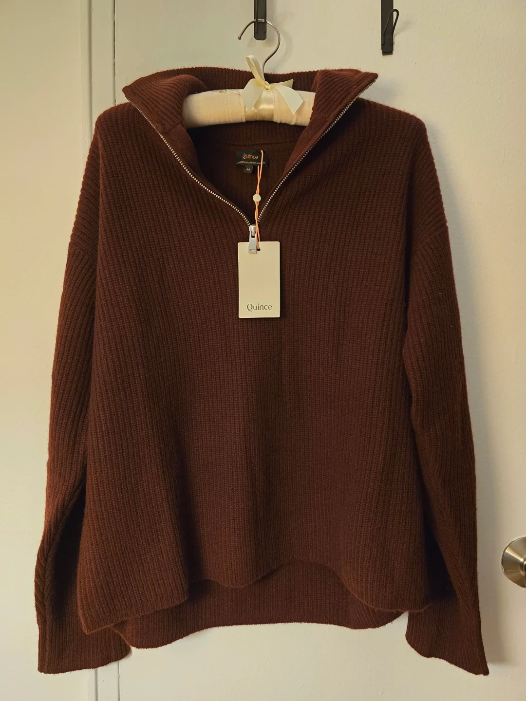 Women Quince Mongolian Cashmere Fisherman Quarter Zip Sweater in rich burgundy. 100% Mongolian Cashmere. Size medium. It has a quarter zip closure and a cozy knit design. Perfect for cooler weather!