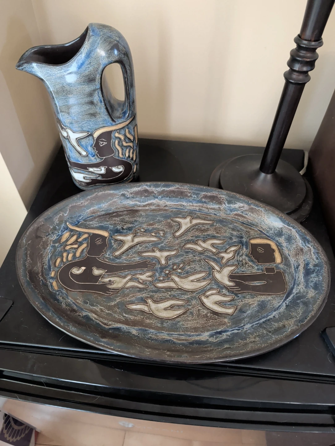 This unique ceramic set features a pitcher and an oval platter, both decorated with a stylized design of people and birds. The glaze has a beautiful blue and brown marbled effect. This handcrafted set would make a lovely decorative piece for your home. Willing to sell separately.
