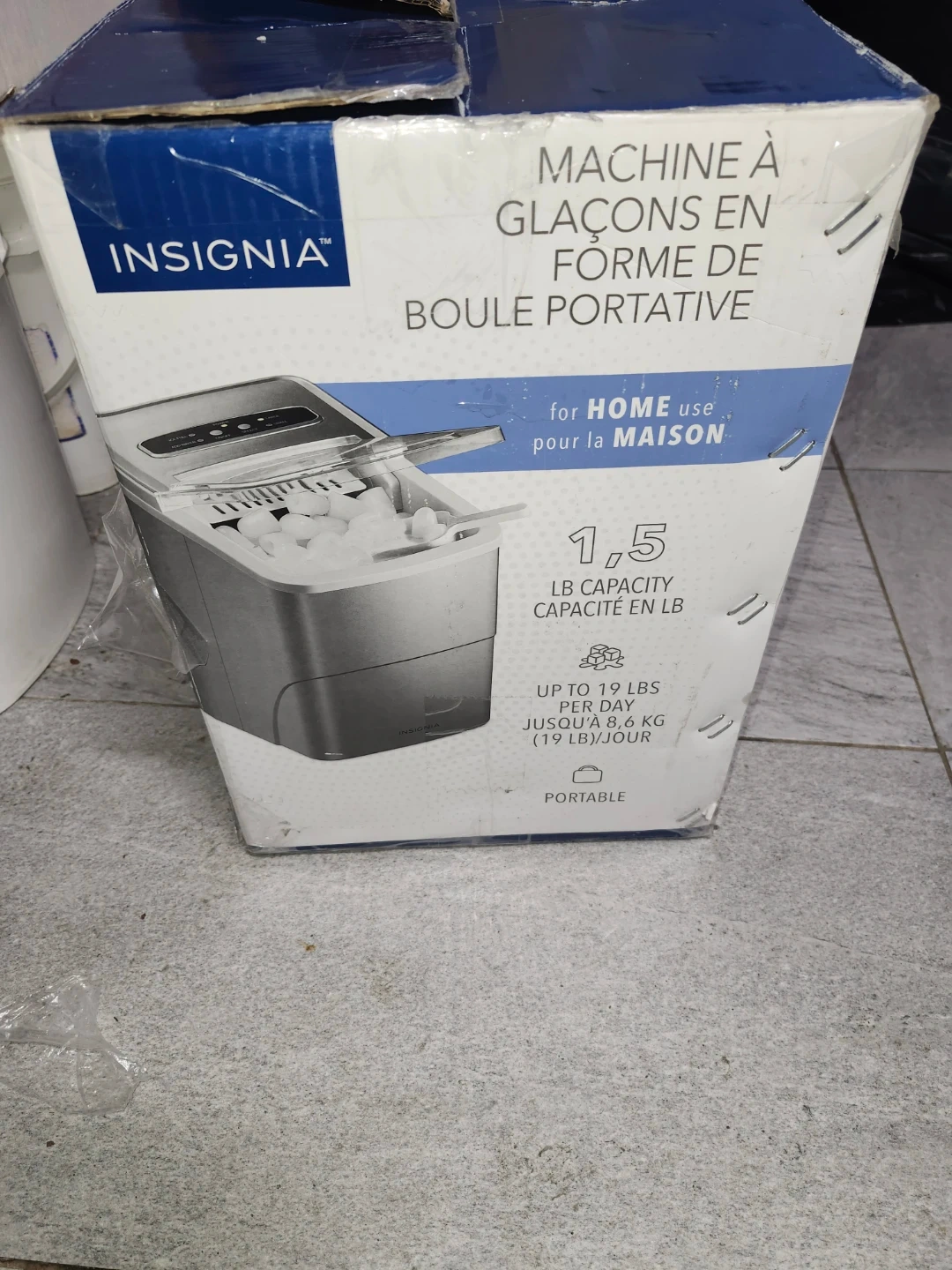 This Insignia ice maker makes ball-shaped ice. It has a 1.5 lb capacity and can produce up to 19 lbs of ice per day. It's portable and designed for home use.