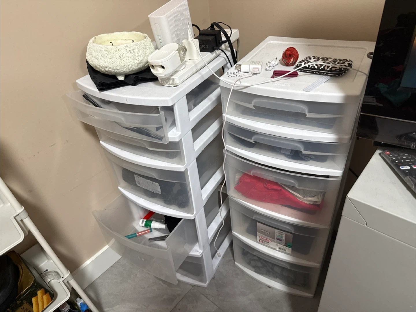 This Sterilite storage unit has five drawers for organizing your space. It's made of white plastic and perfect for storing clothes or other household items. Great for decluttering any room! Can pick up anytime near 71a ave and 124 street