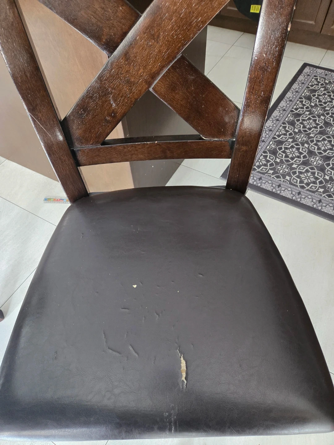 This dark wood dining chair has a brown faux leather seat. The seat shows some signs of wear and tear, with cracking and a small rip. Wood frame with a distinctive criss-cross back design.