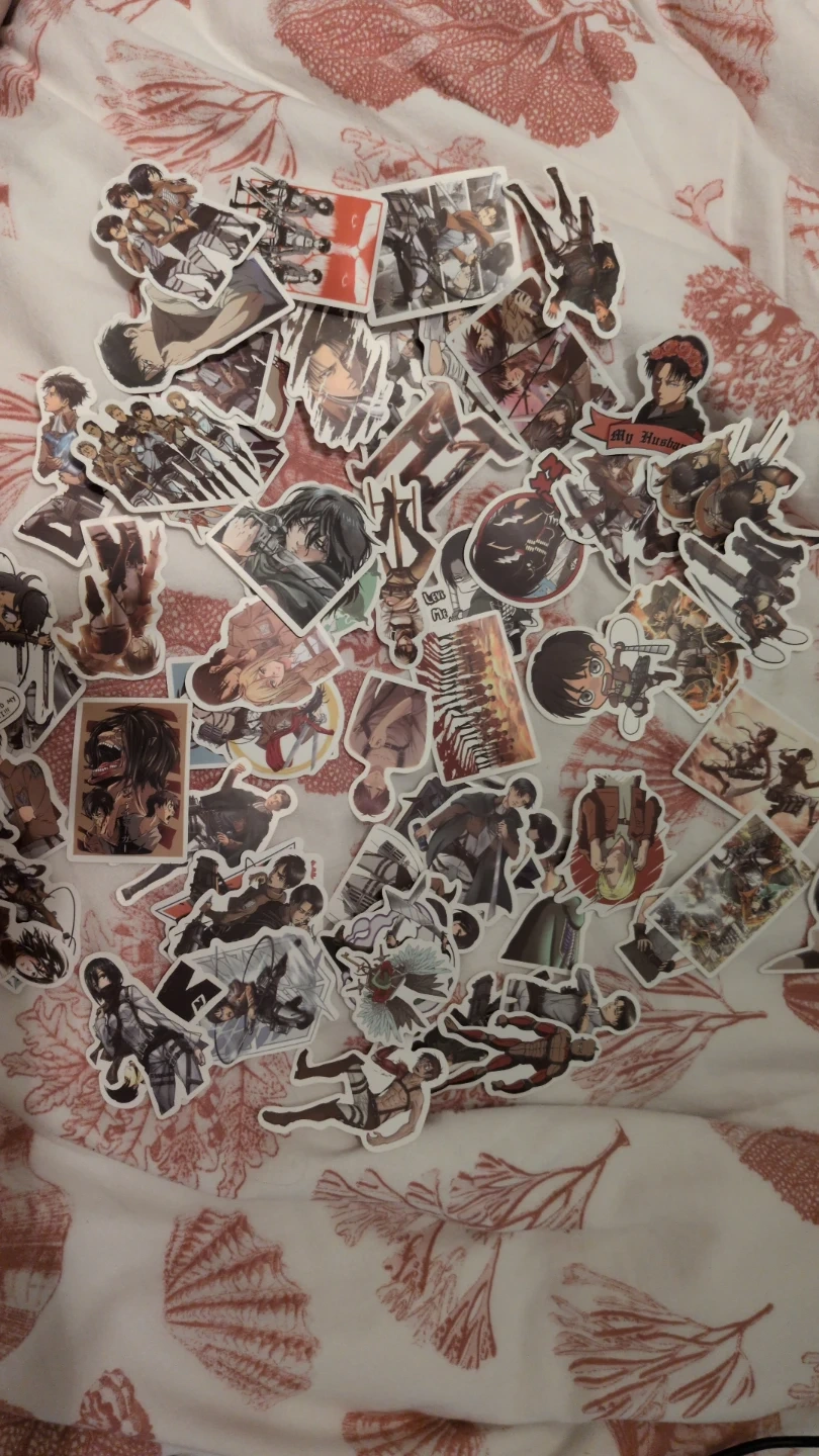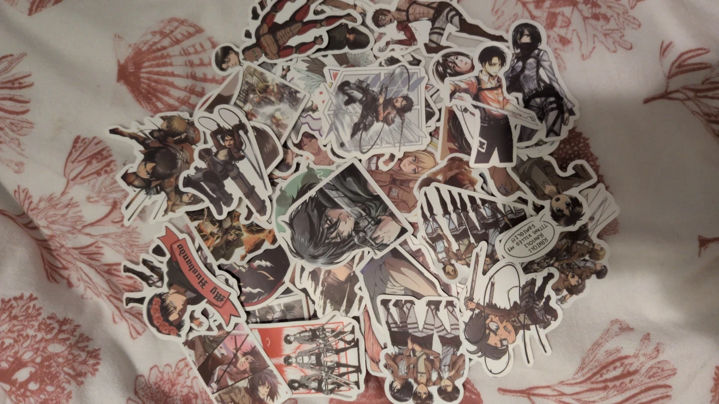 A large collection of Attack on Titan stickers featuring various characters and scenes from the anime. These vinyl stickers are durable and perfect for personalizing laptops, water bottles, or notebooks. They're great for any anime fan's collection!