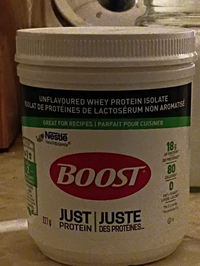 2x Boost Unflavoured Whey Protein Isolate is great for recipes. It contains 18g of protein and 80 calories per serving. This is just protein.