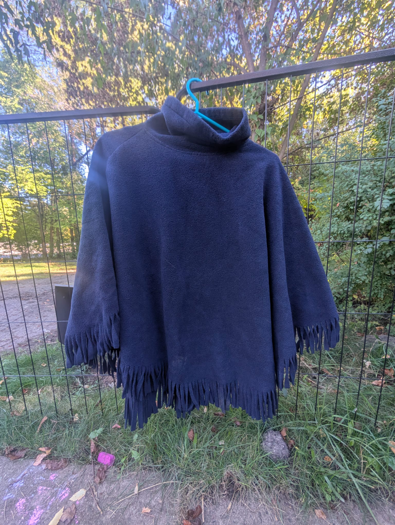 Cozy Urban Muth fleece poncho! It's in great condition and perfect for layering on chilly days. The poncho features a stylish turtleneck and fun fringe detailing along the bottom. It's a versatile piece that can be dressed up or down, making it a great addition to your wardrobe