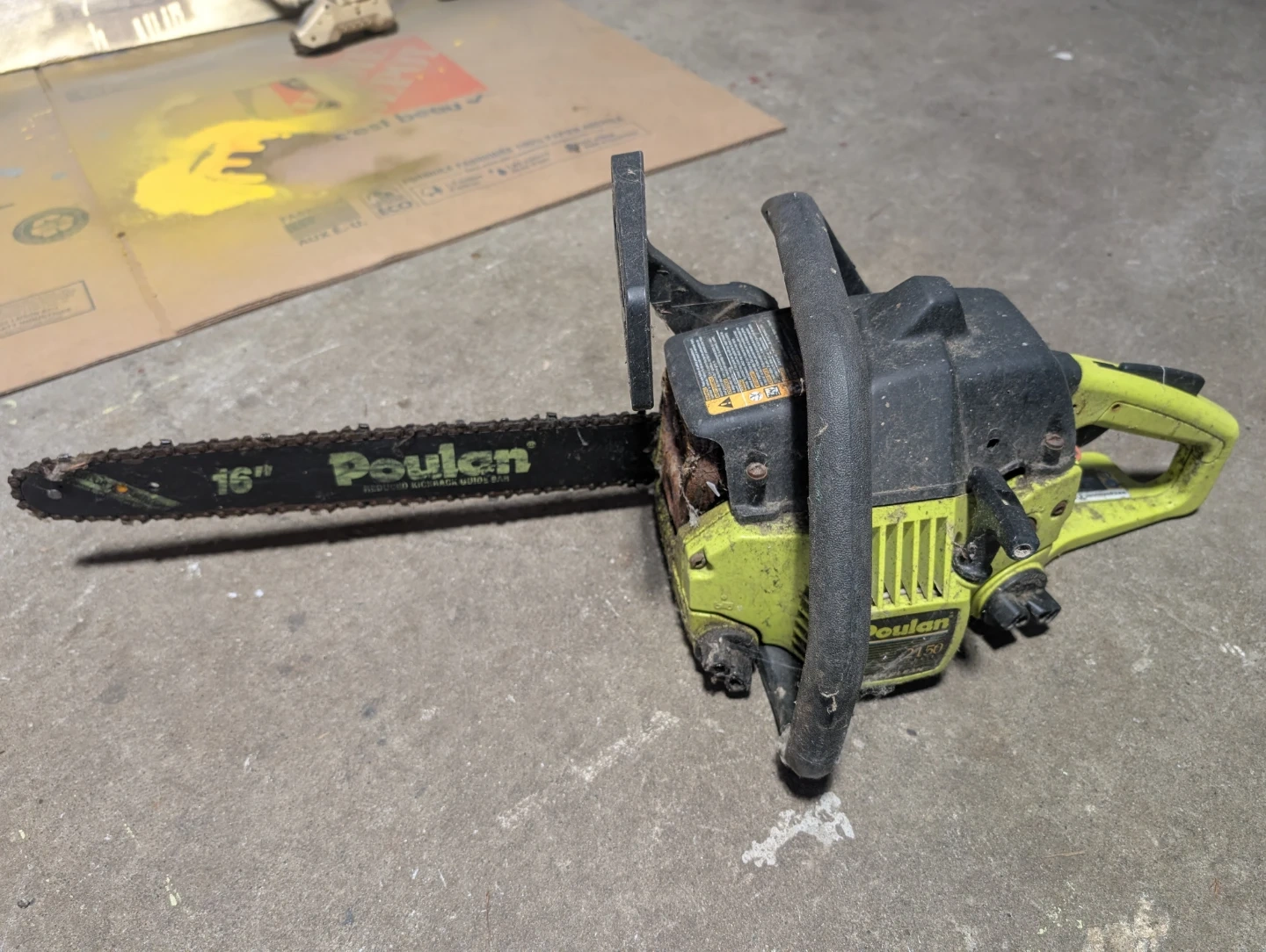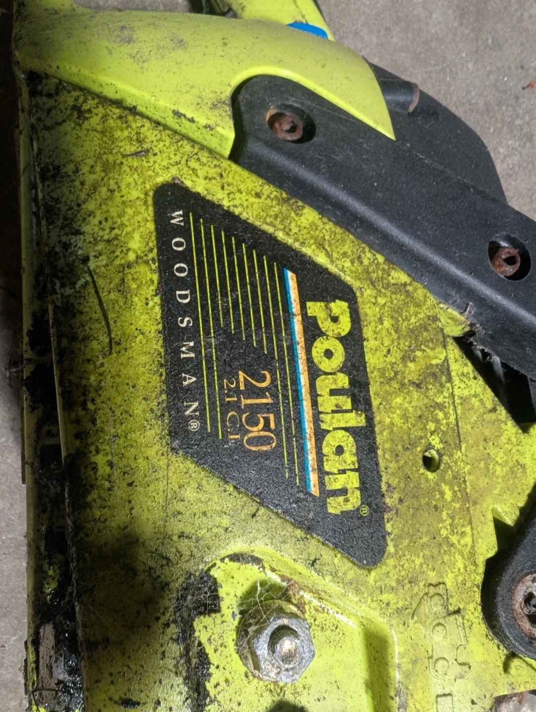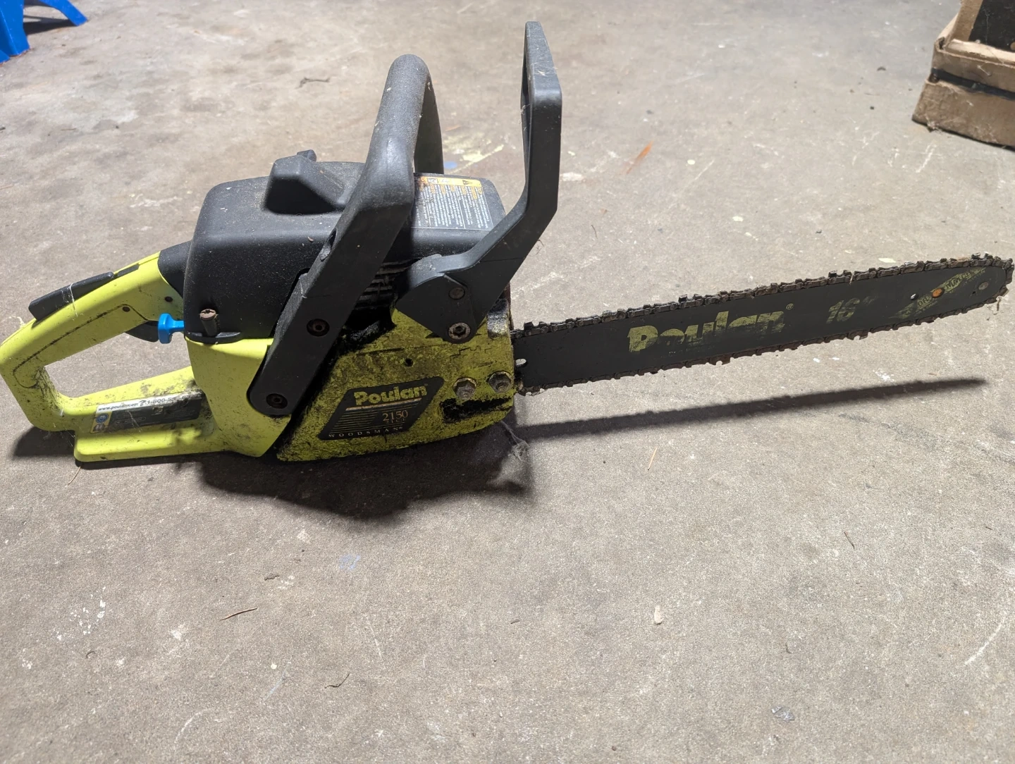 Poulan 2150 Woodsman chainsaw with a 16-inch bar. It's a 2.1 cu. in. model. This chainsaw is good for cutting firewood or clearing brush. Used but in perfect working condition.