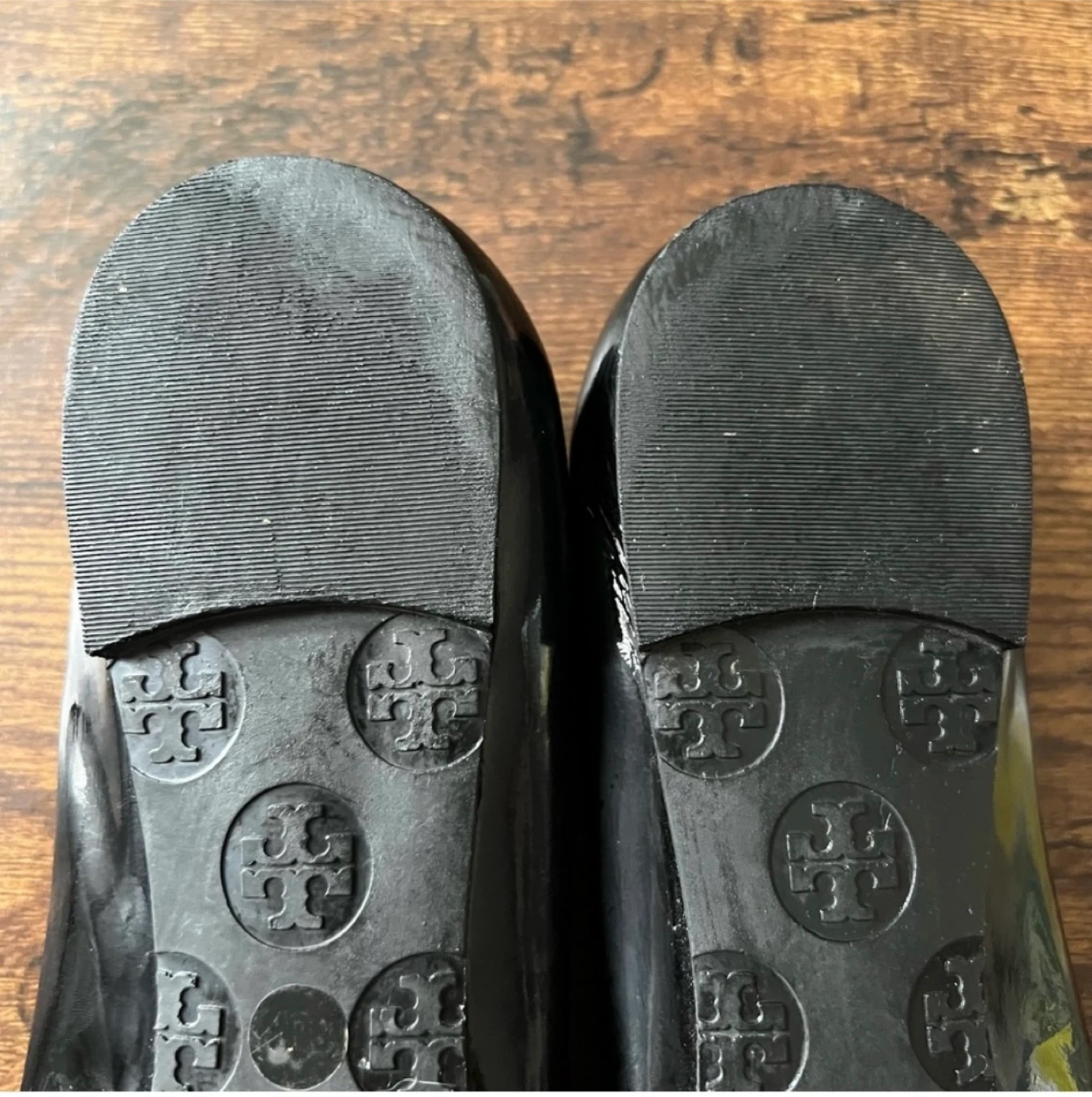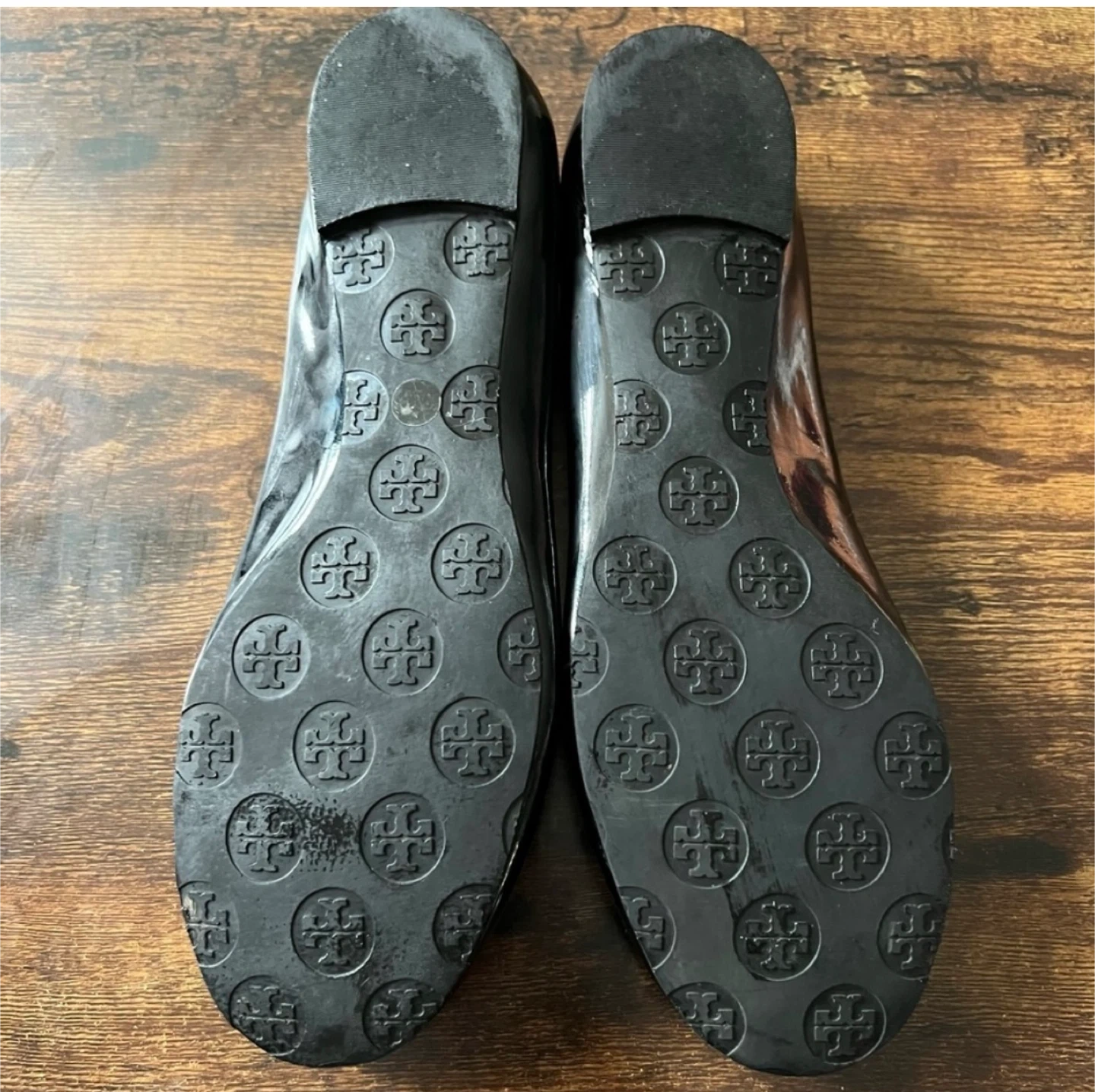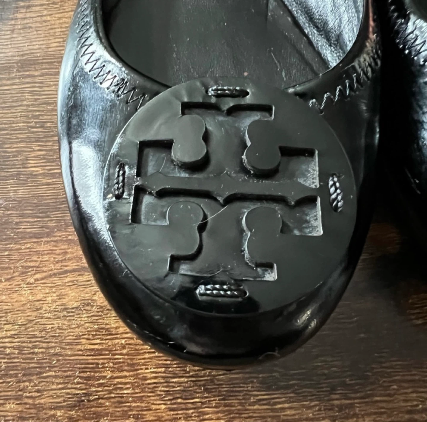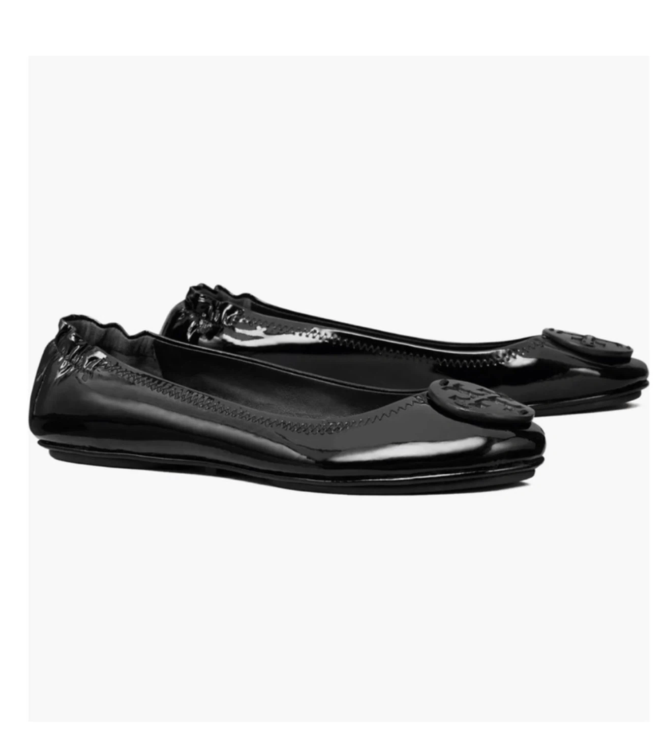 Classic Tory Burch ballet flats in black patent leather. These shoes feature the signature Tory Burch logo on the toe. A comfortable and stylish option for everyday wear.