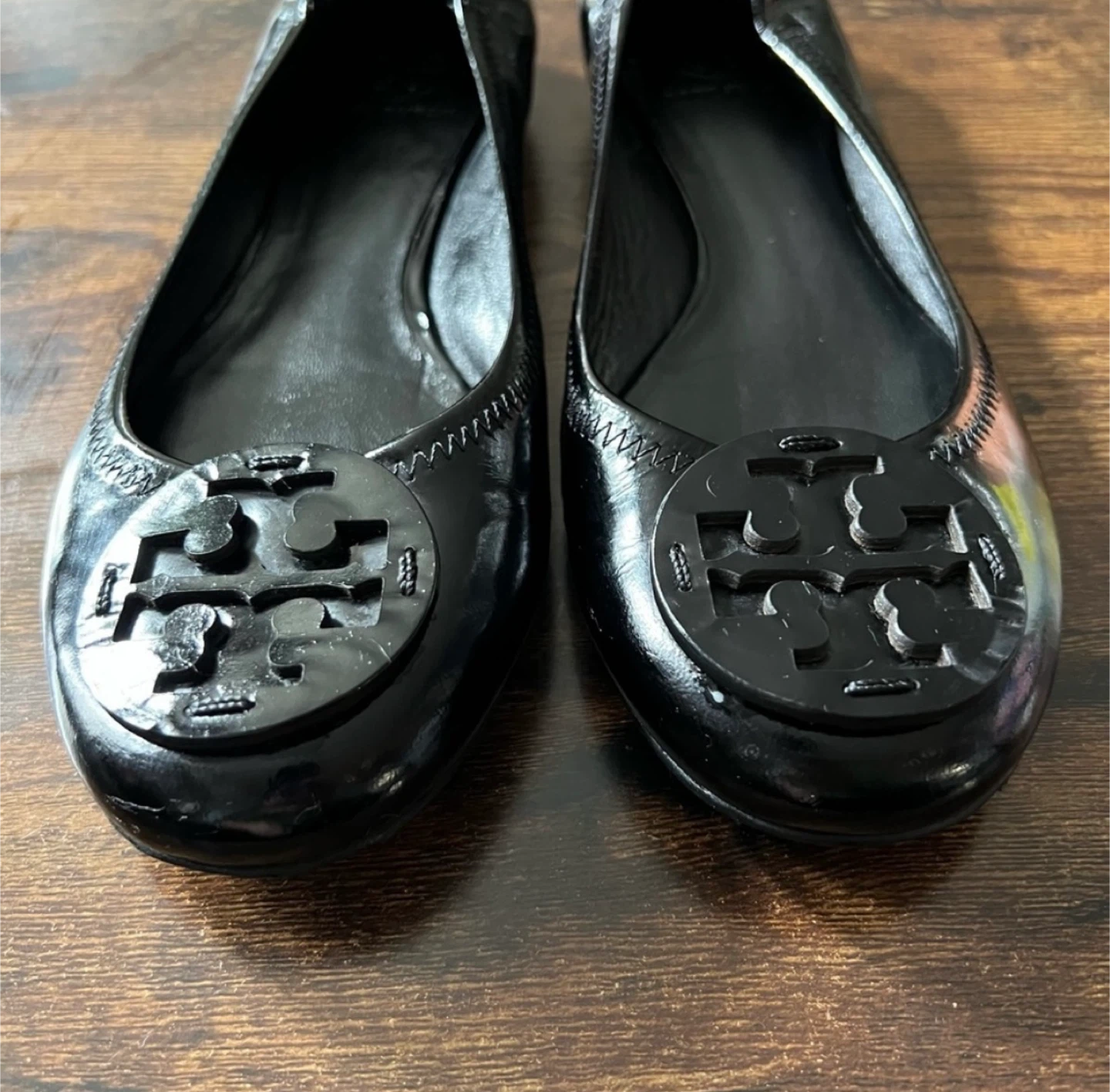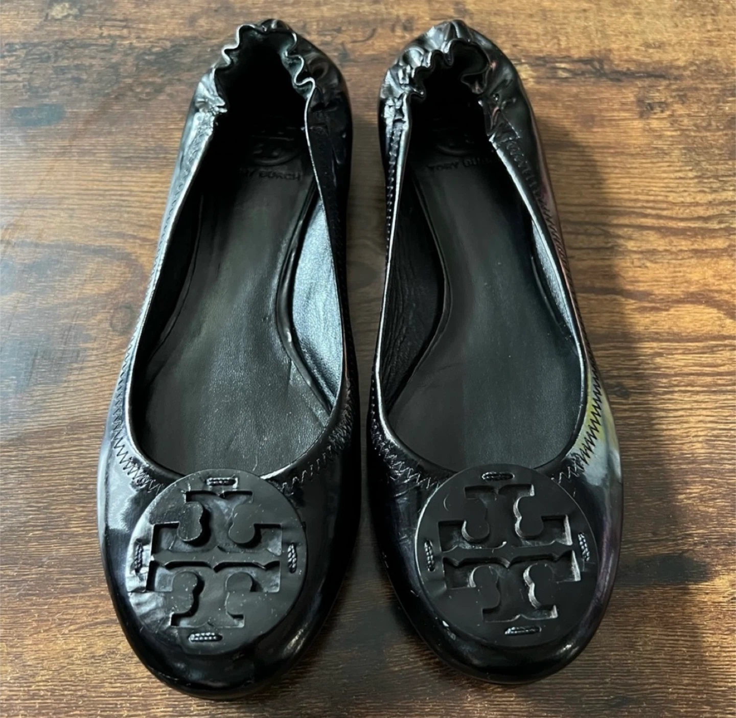 Classic Tory Burch ballet flats in black patent leather. These shoes feature the signature Tory Burch logo on the toe. A comfortable and stylish option for everyday wear.