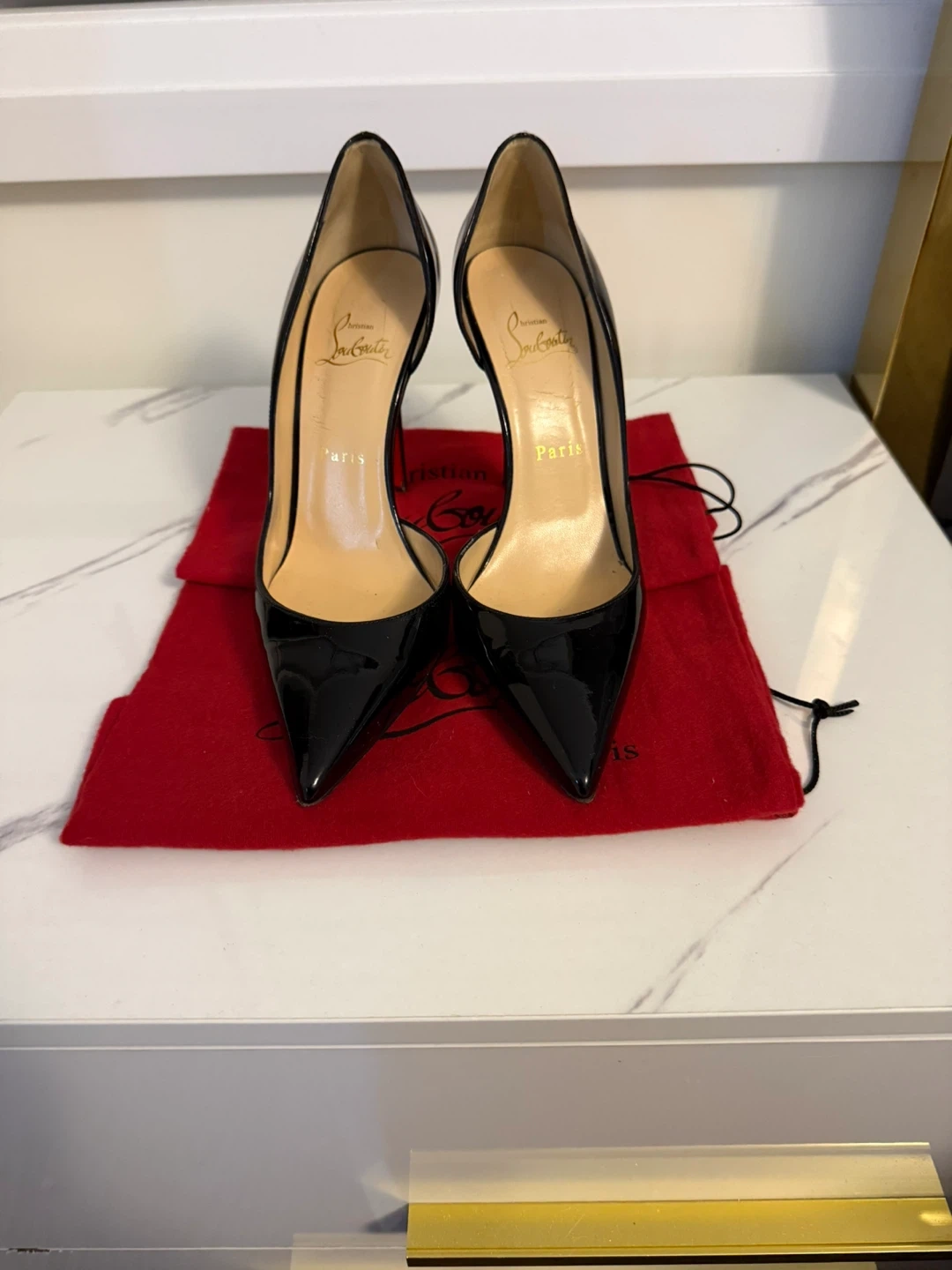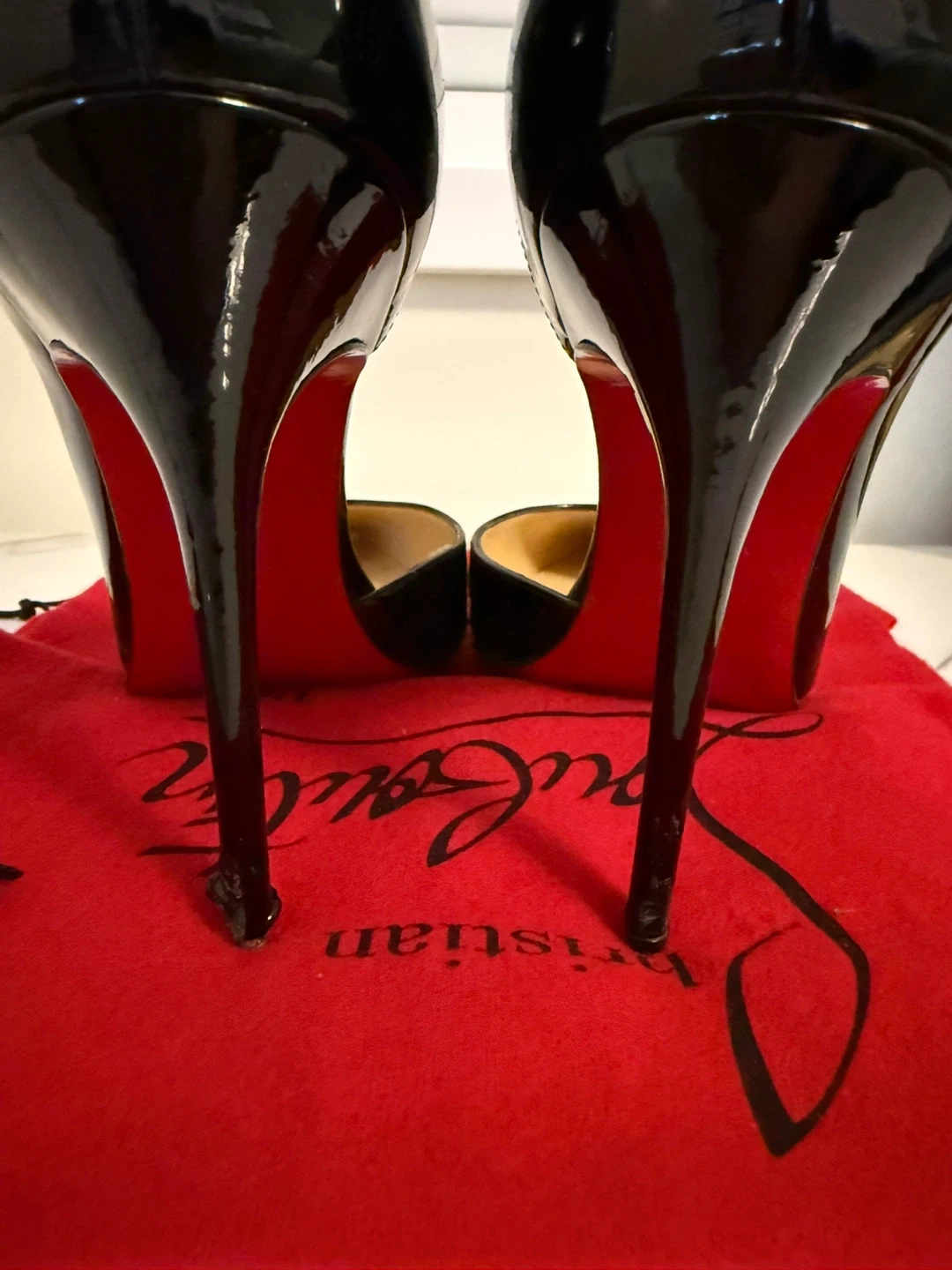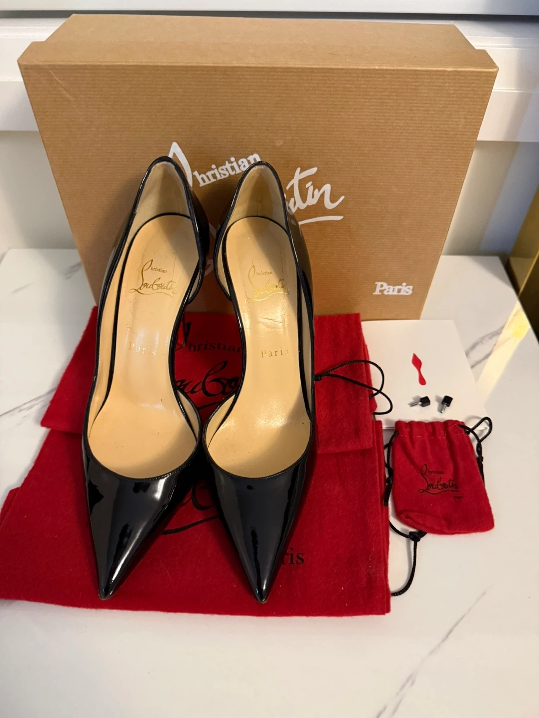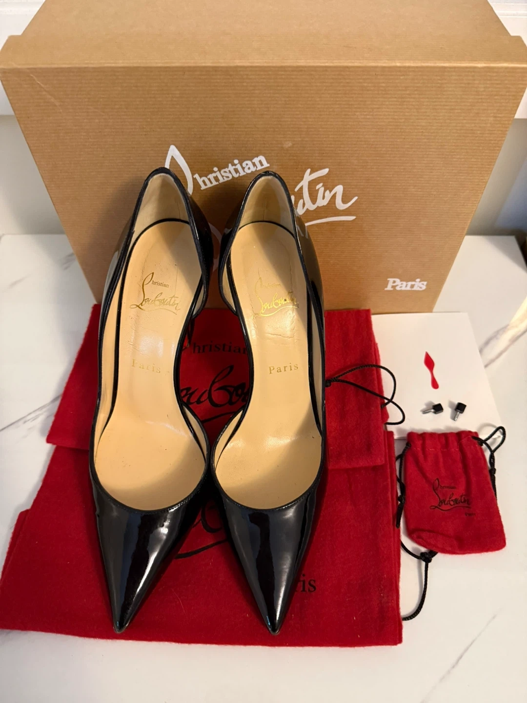Classic Christian Louboutin heels in black patent leather. Comes with dust bags and original box. These iconic shoes are made in Italy.
