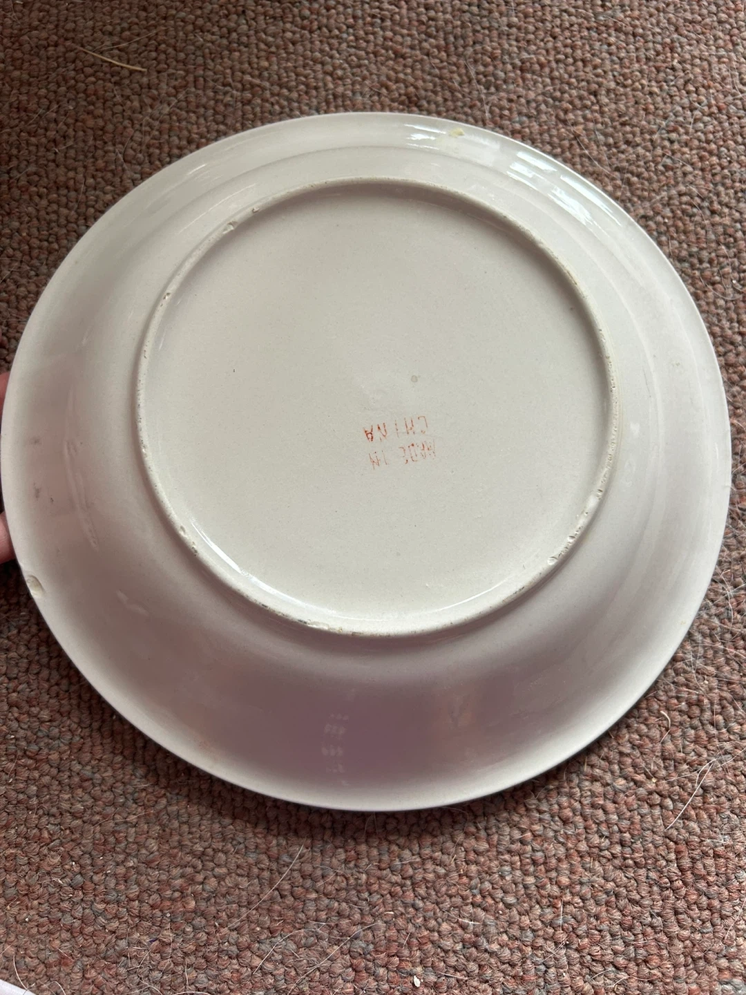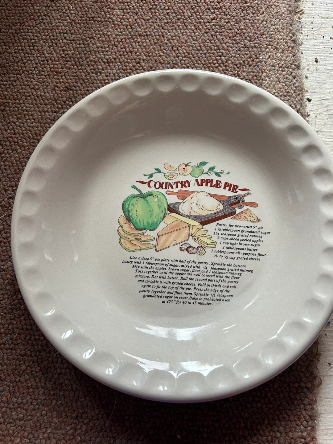 Ceramic pie plate featuring a recipe for country apple pie. It has decorative apples, cheese, and rolling pin graphics. Made in China. Dishwasher safe.