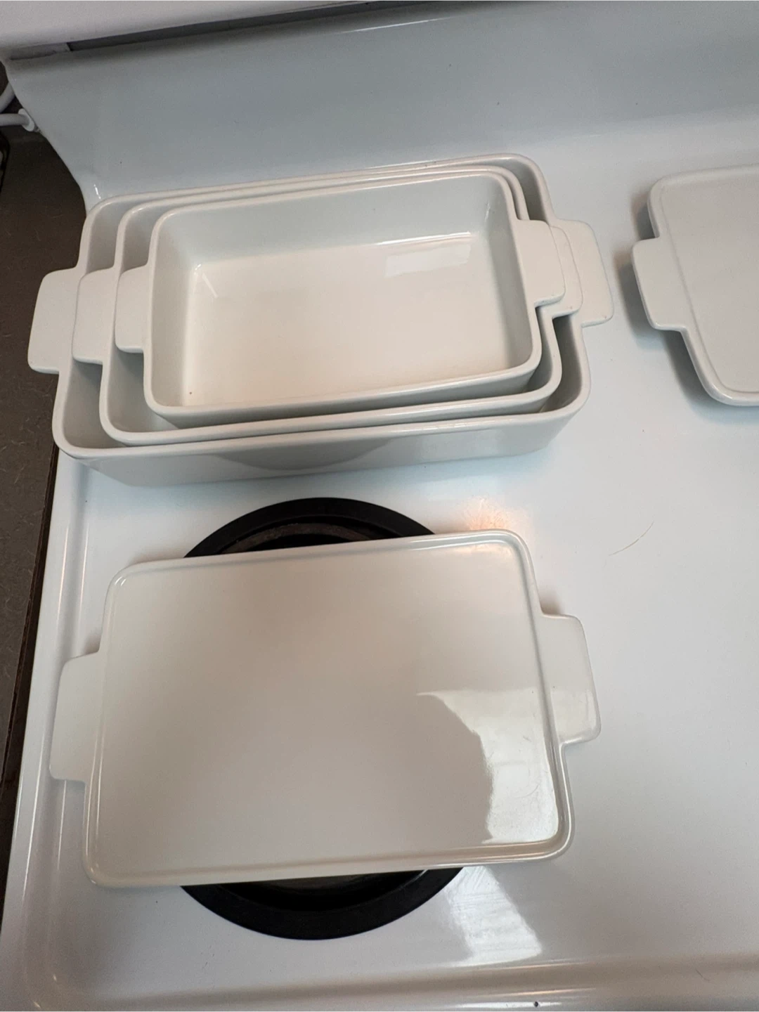 Set of 3 white ceramic rectangular baking dishes with covers. Dishwasher and microwave safe.