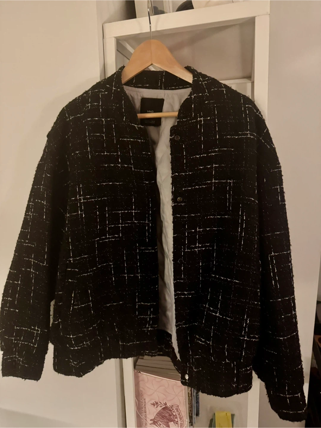 This MNG bomber jacket features a black and white tweed pattern with a subtle grid design and silver thread detail. Like new