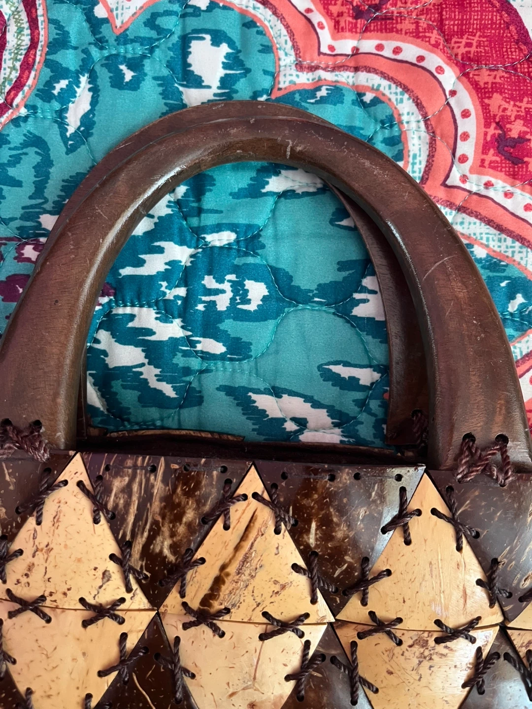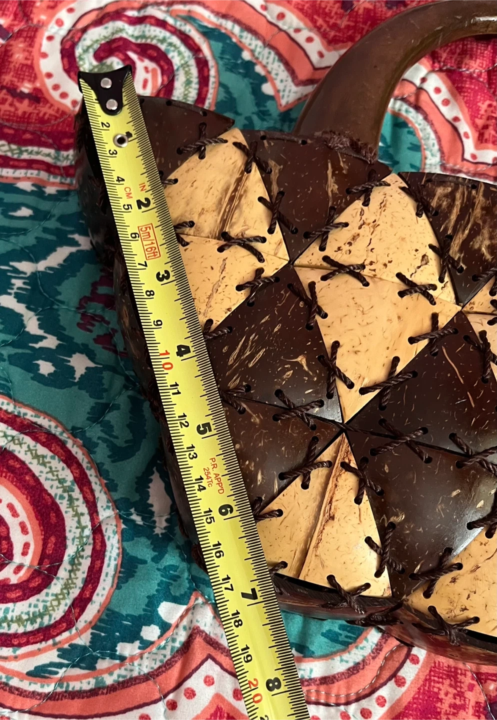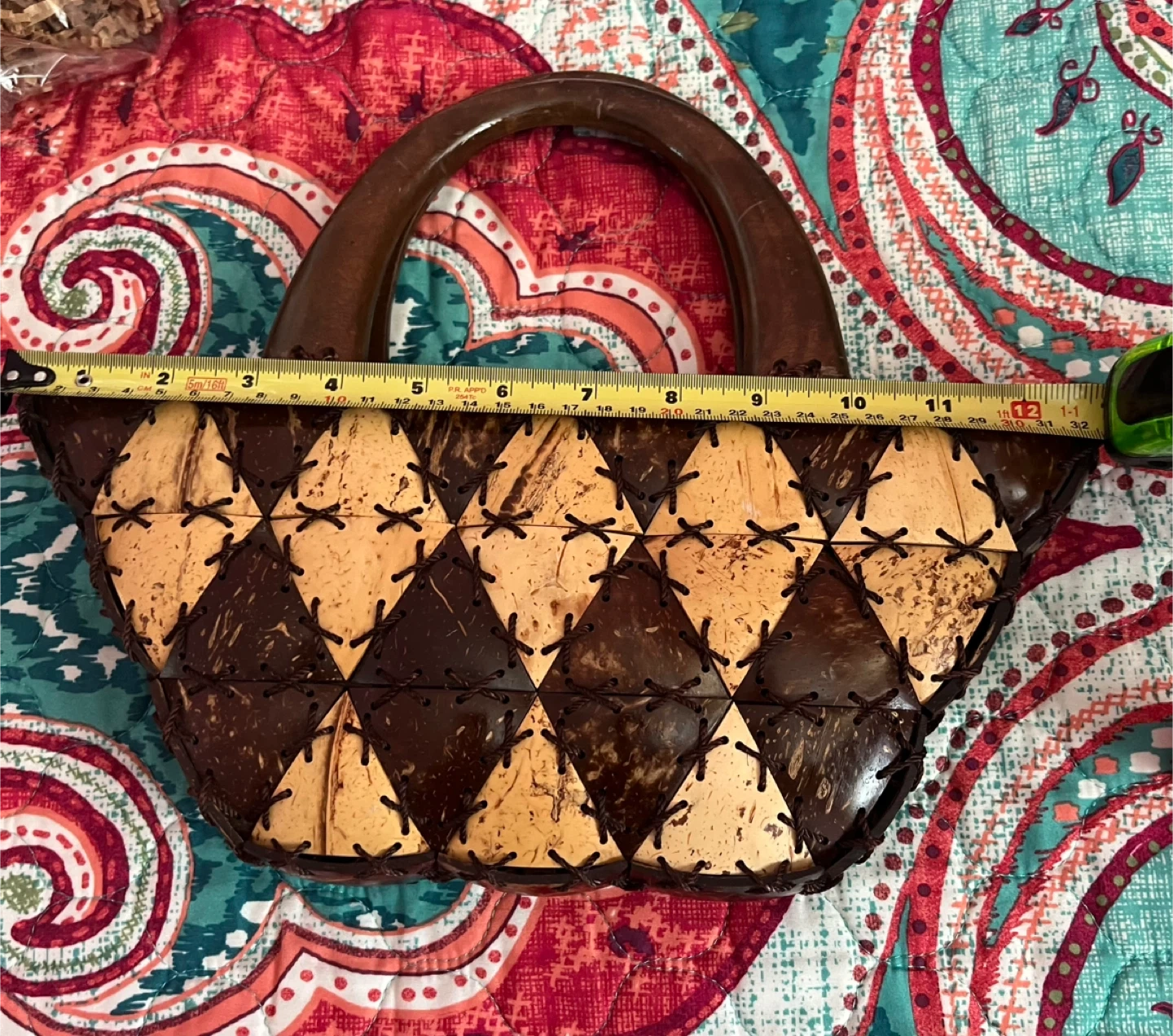 Check out this unique handmade purse! It's made from coconut shell pieces in a diamond pattern, with sturdy wooden handles. The inside has a zipper closure. It measures about 12 inches across