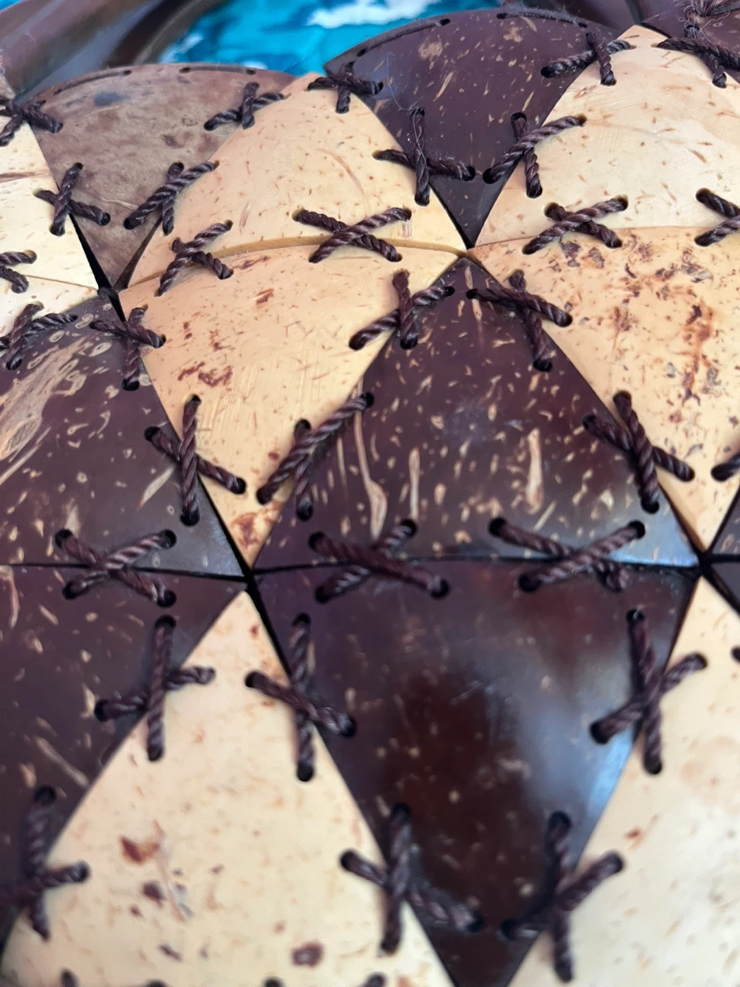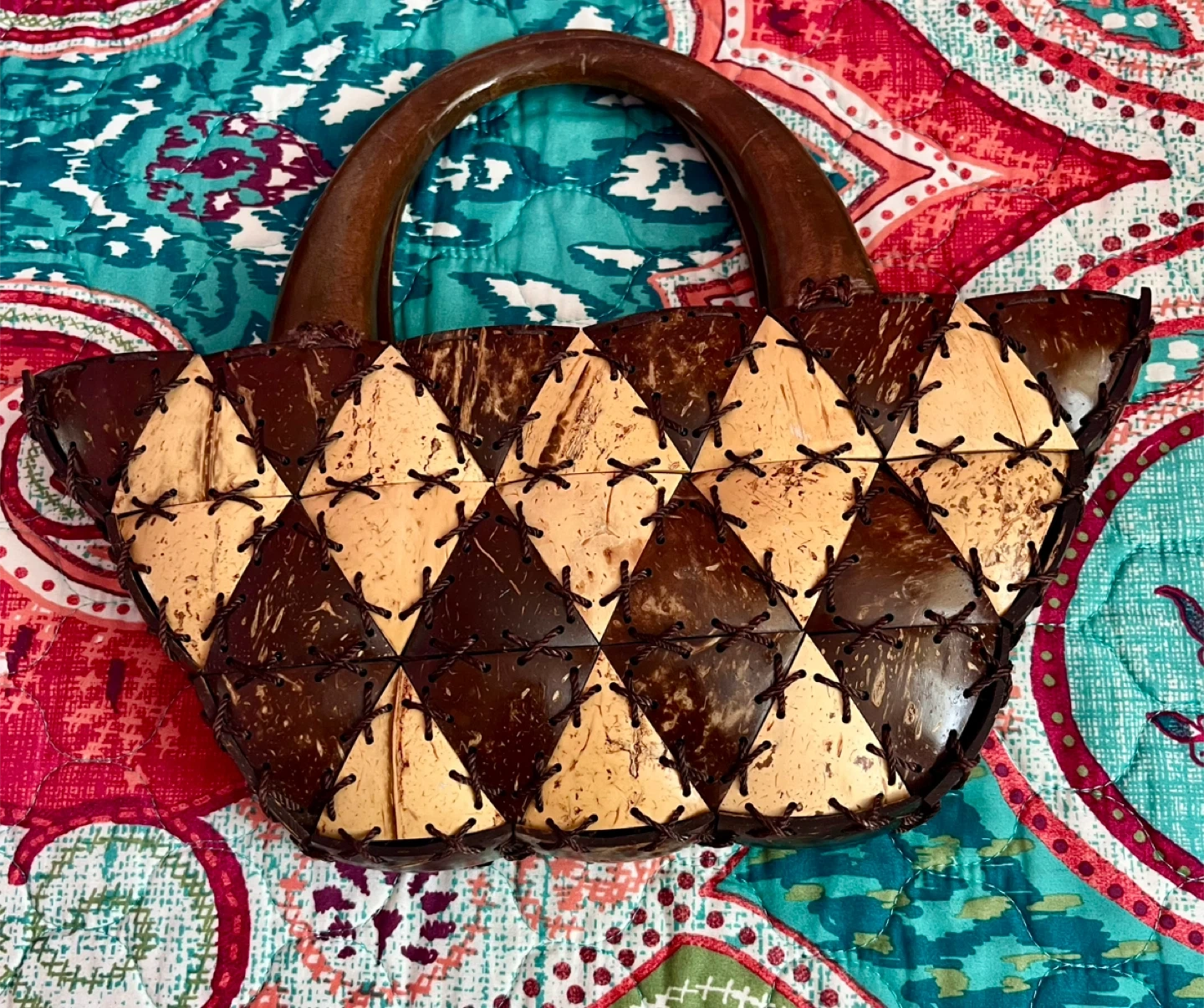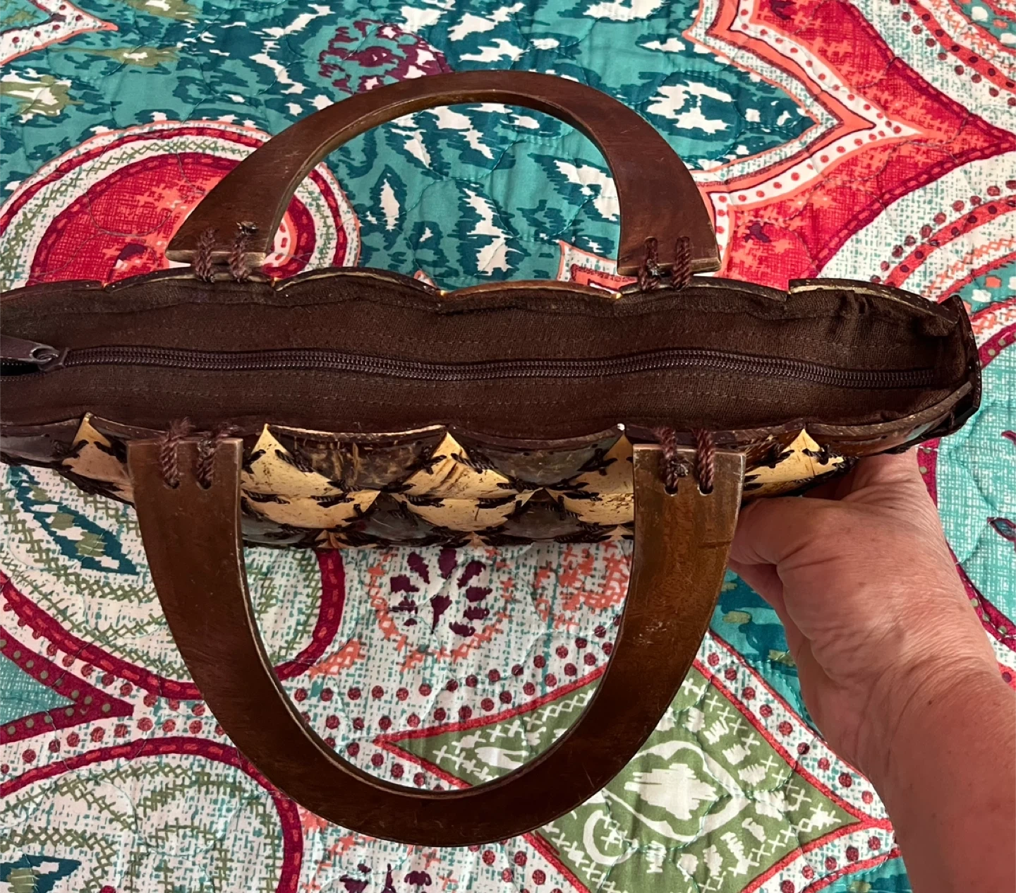 Check out this unique handmade purse! It's made from coconut shell pieces in a diamond pattern, with sturdy wooden handles. The inside has a zipper closure. It measures about 12 inches across